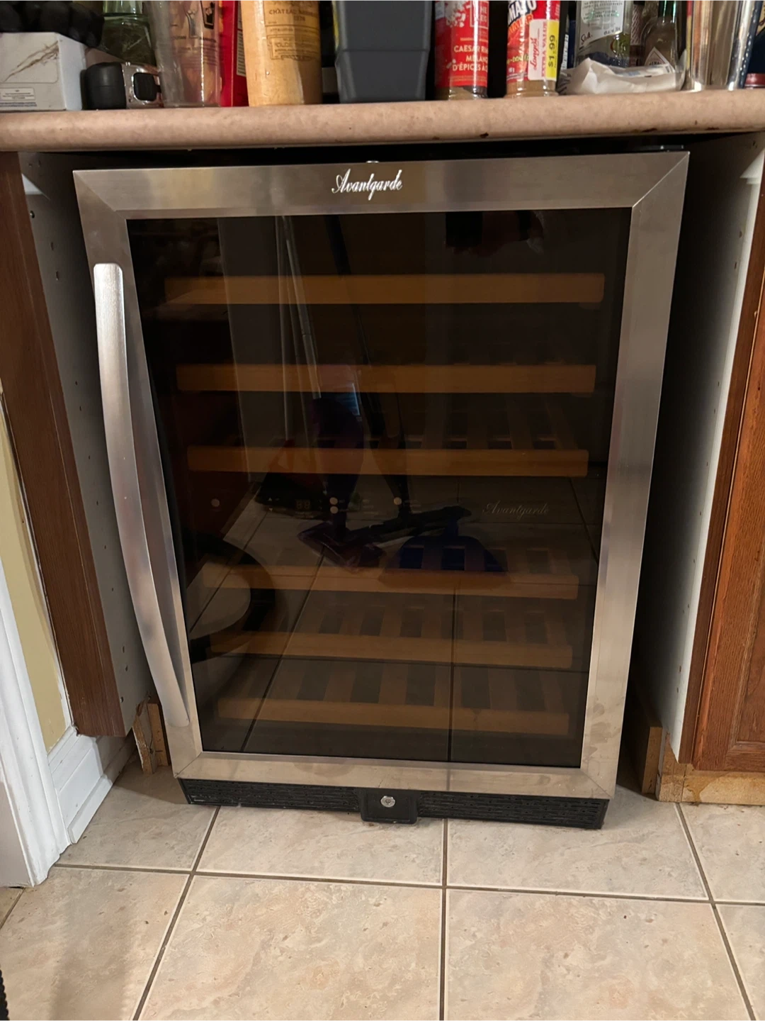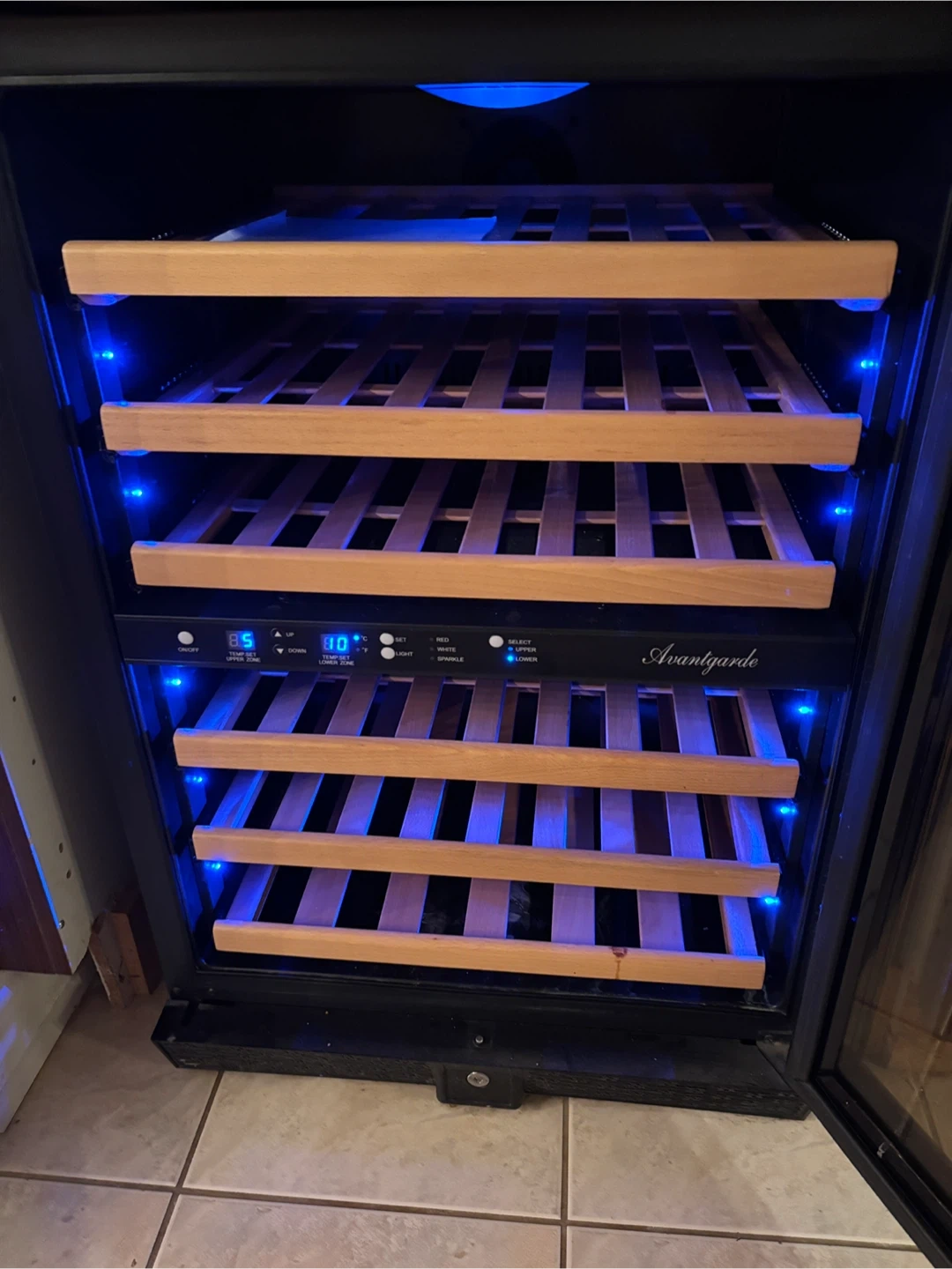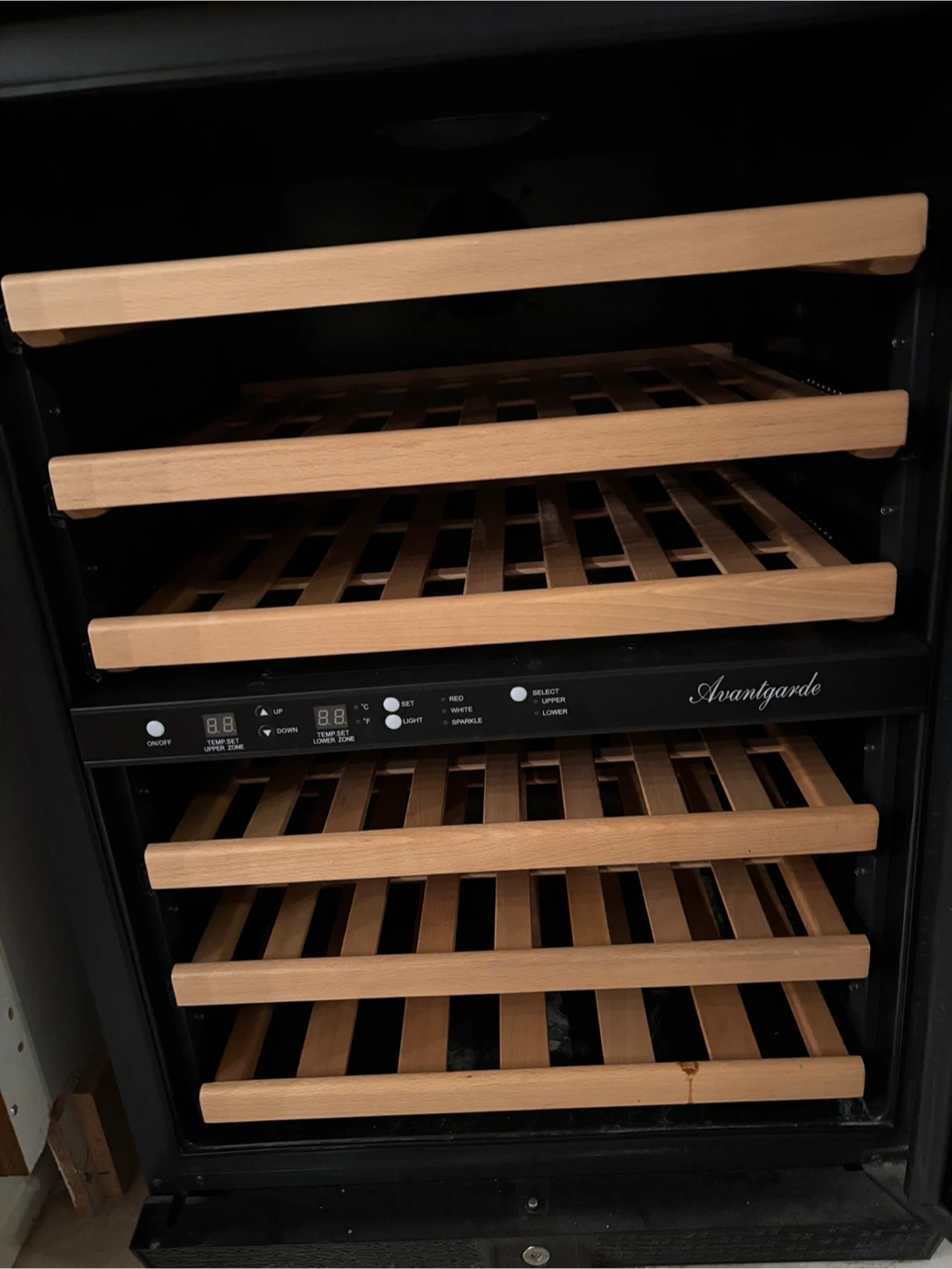 Avantgarde wine fridge with multiple wooden shelves. Features digital temperature control and interior lighting. Holds 40 bottles.