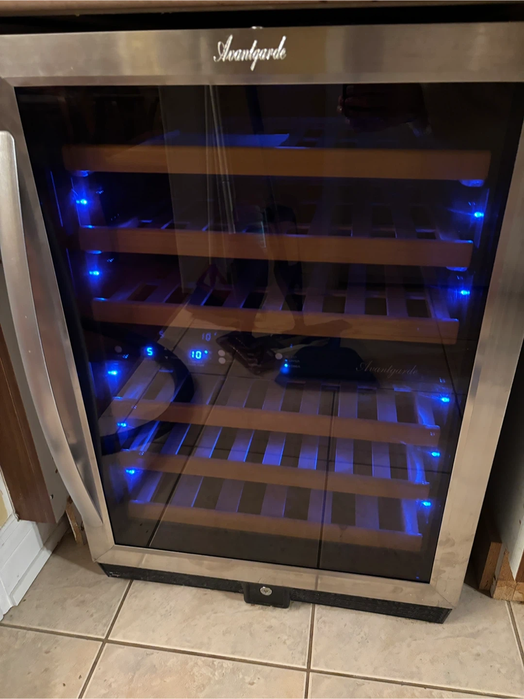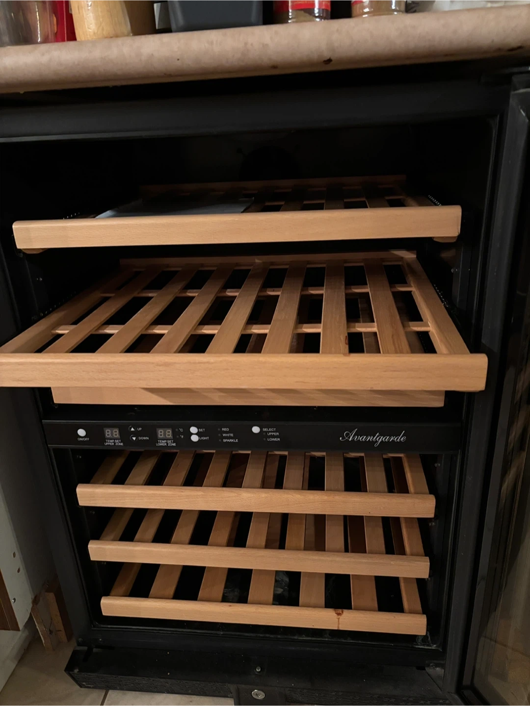 Avantgarde wine fridge with multiple wooden shelves. Features digital temperature control and interior lighting. Holds 40 bottles.
