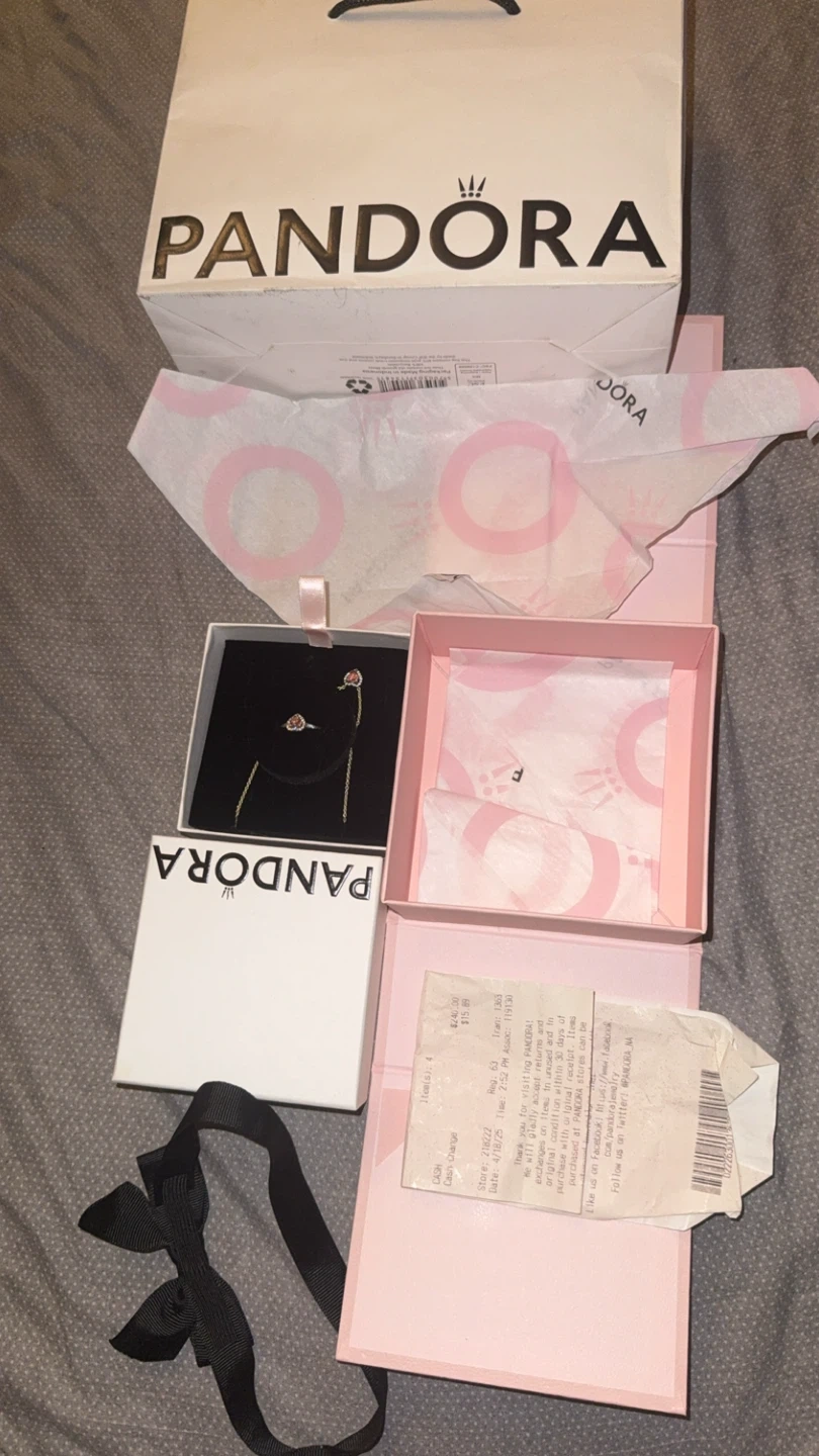 Pandora necklace and ring set in rose gold. Includes original Pandora bag, boxes, tissue paper, and receipt. Purchased on 4/18/25. This set is a lovely gift for someone special! Never used