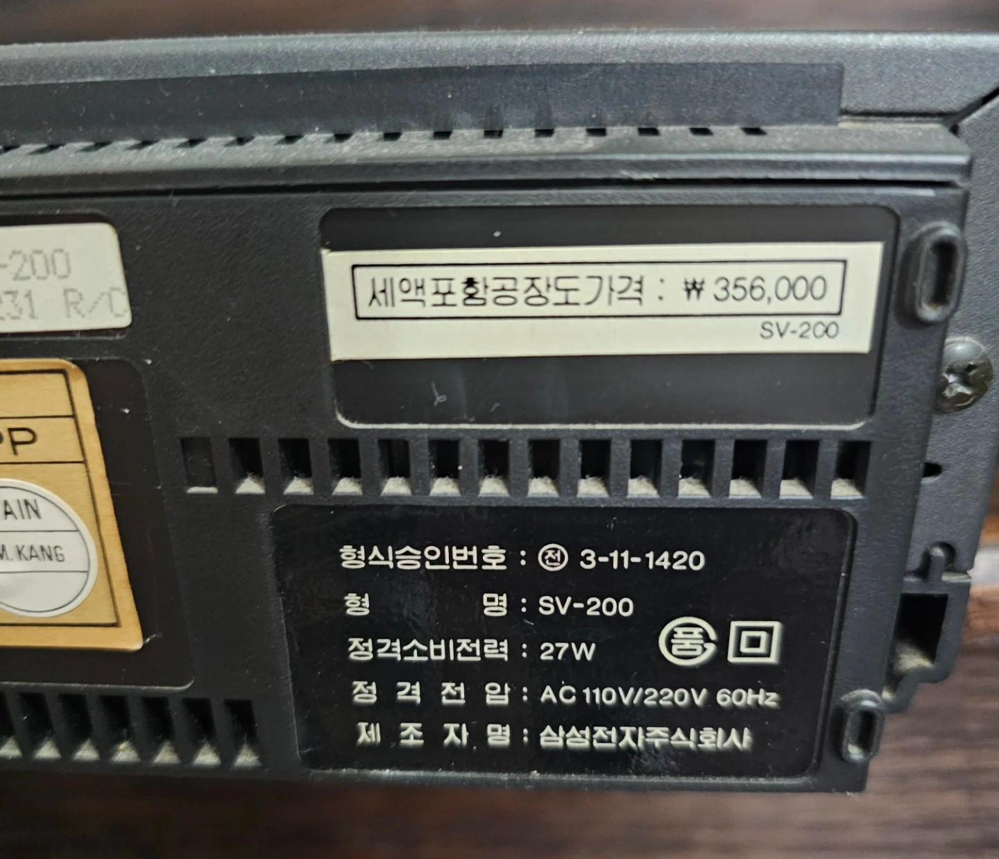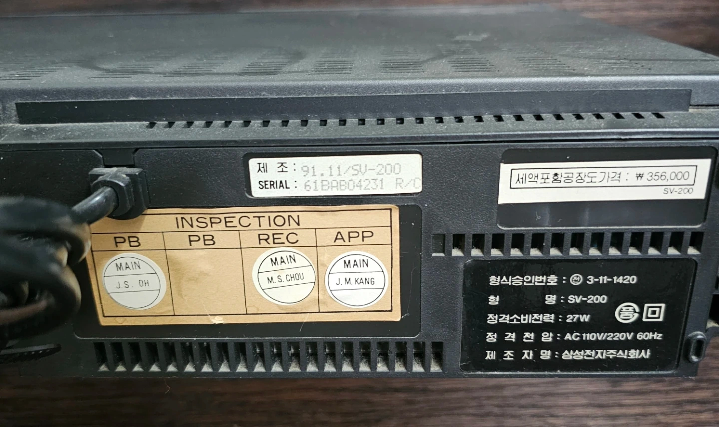 This is a Samsung SV-200 VCR. It has HQ built-in auto head cleaner and OSD. Power consumption is 27W.