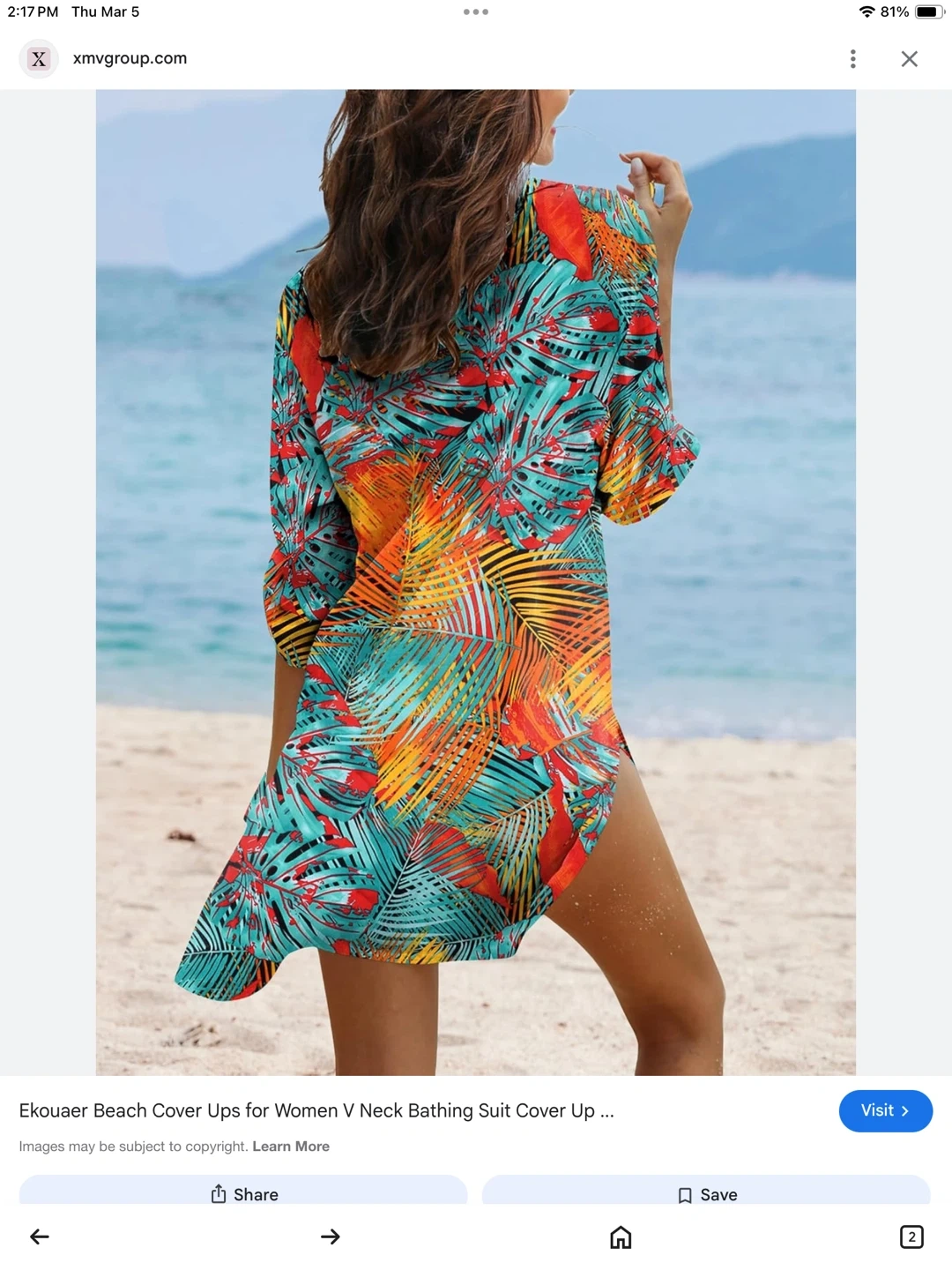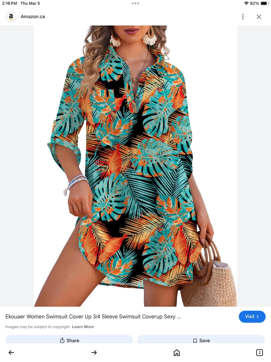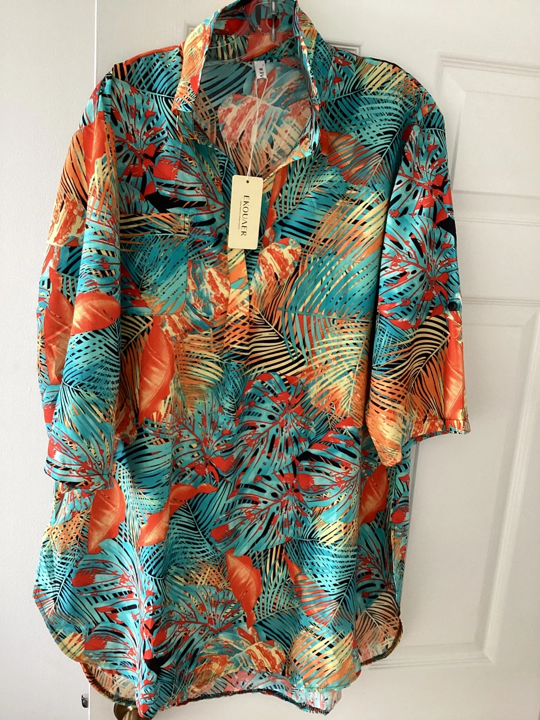 This women's comfortable beautiful swimsuit cover-up features a vibrant tropical print. It's a stylish choice for beach or pool days. Size large.