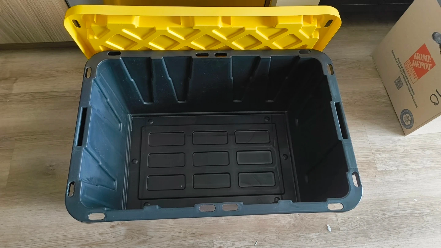 This is a grey plastic storage bin with a yellow lid. It's great for organizing your belongings. The lid has a textured grip pattern.