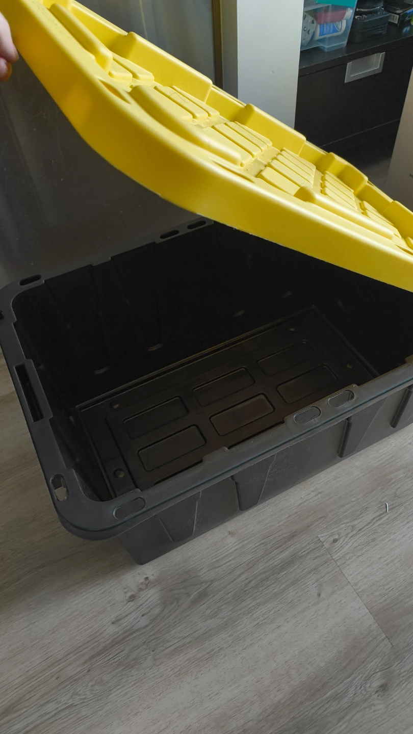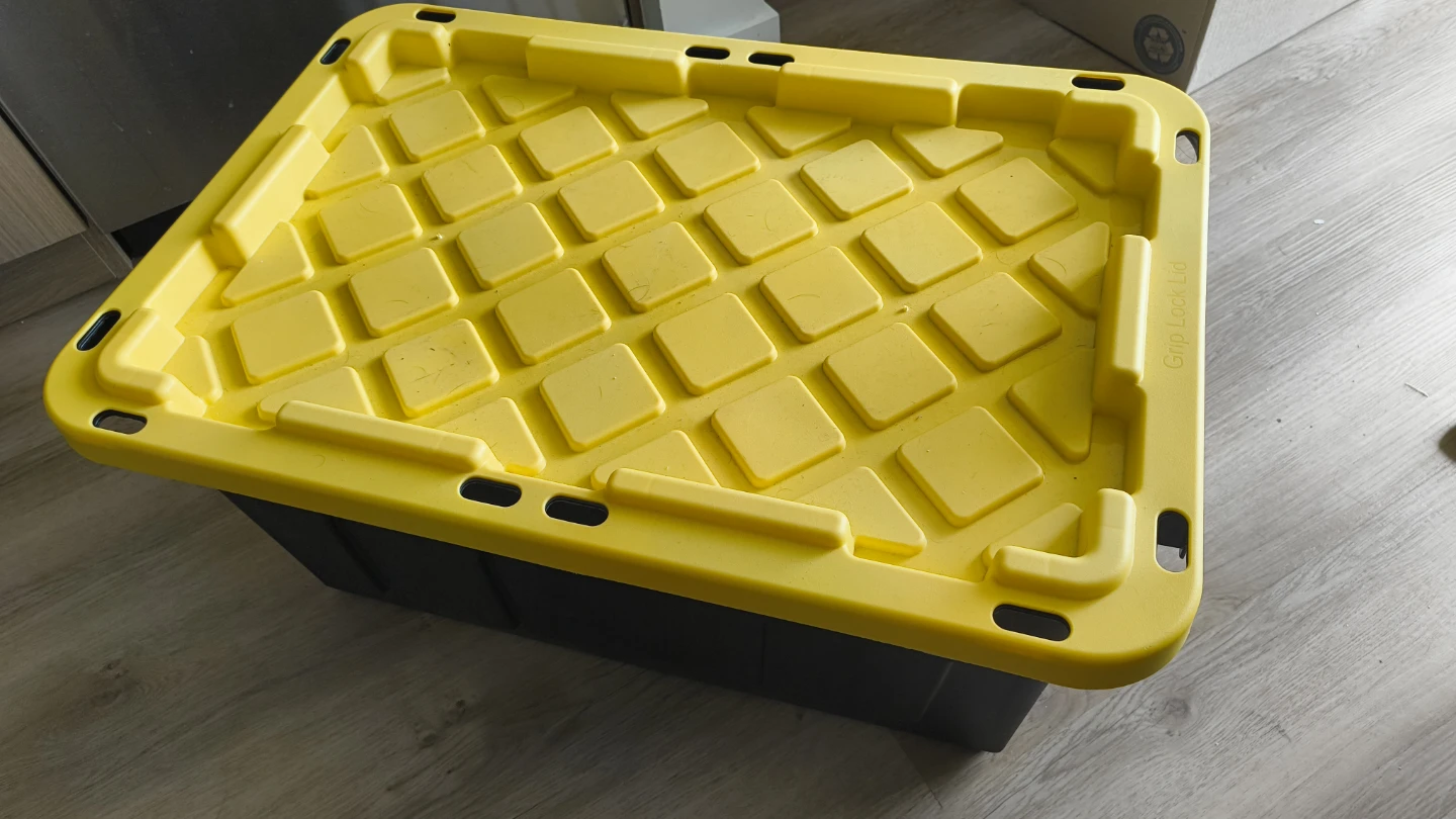 This is a grey plastic storage bin with a yellow lid. It's great for organizing your belongings. The lid has a textured grip pattern.