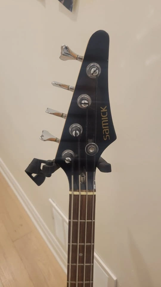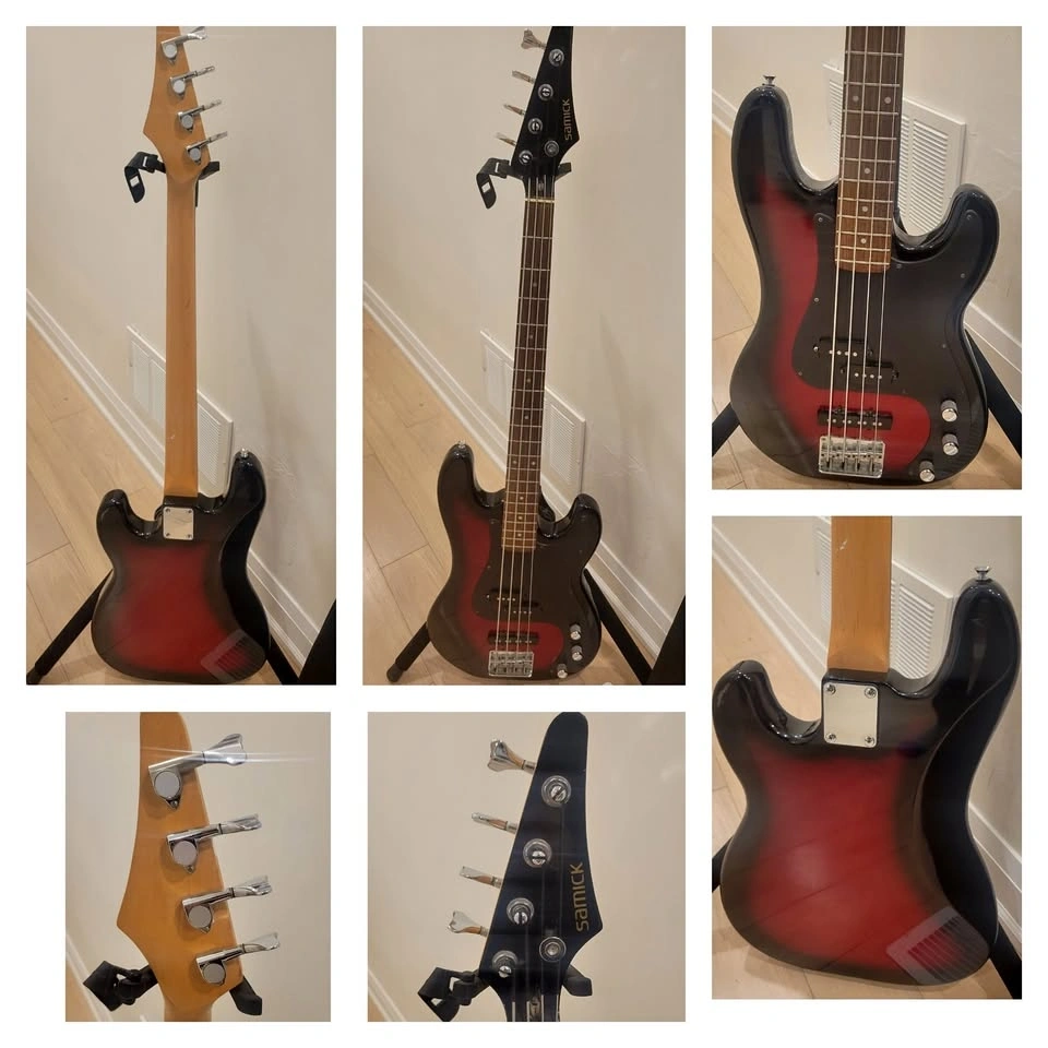 This Samick bass was made in Korea. It has a maple neck, precision + jazz pick-ups, vol/vol/tone controls, and a rosewood fretboard. I will adjust the neck relief and string heights to maximize its playability. All of my guitars have a one-year warranty from me. I have over 200 guitars and basses available. You can see more at https://www.torontoguitar.com/guitars-bass-for-sale. I'm located near Kennedy and Ellesmere in Toronto (M1P 2A1). I can also meet in King City on regular school days. Feel free to message if you have any questions!