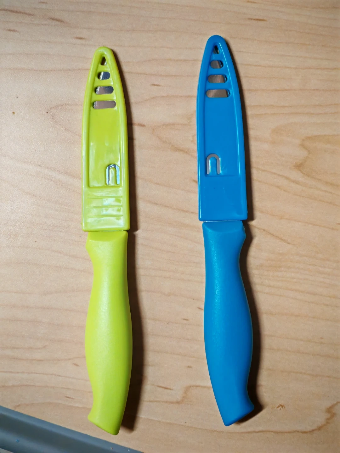 Two kitchen knives, one yellow and one blue, with matching protective sheaths. Handles are ergonomic for a comfortable grip. Blades appear to be stainless steel.