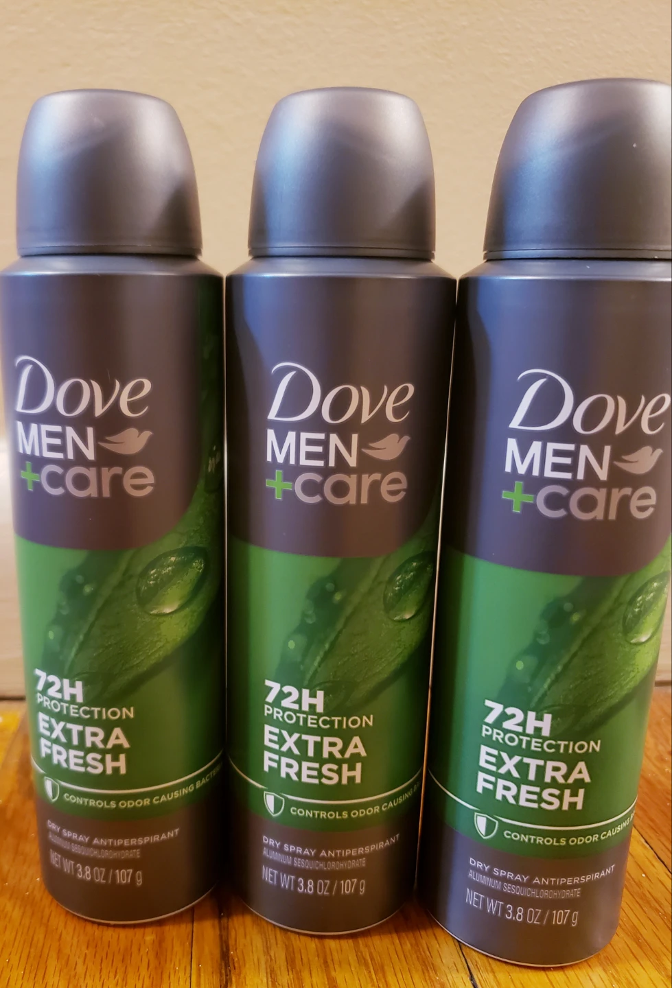 Dove Men+Care Extra Fresh Dry Spray Antiperspirant. It offers 72H protection and controls odor causing bacteria. Net weight is 3.8 oz / 107 g