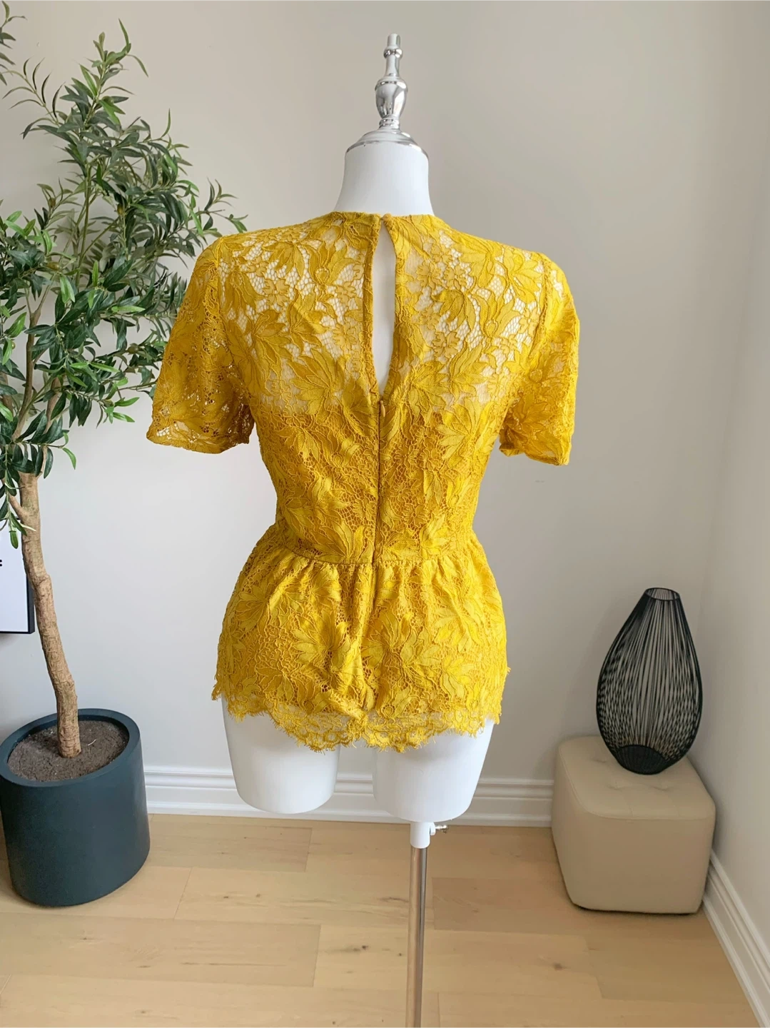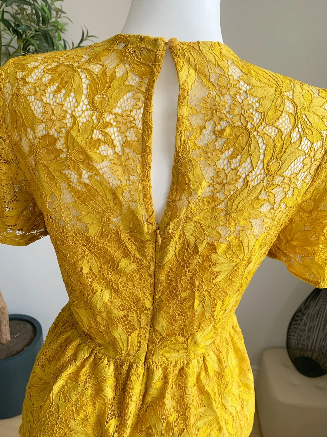 Feminine fitted waist with flared hem that enhances the silhouette. Beautiful floral lace texture throughout.
