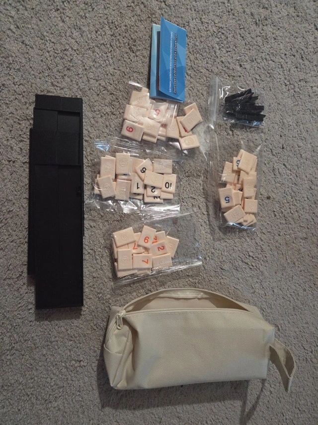 A brand new, never used Rummikub set specifically designed for travel and portability. This version features lightweight, thin tiles and compact folding racks that fit perfectly into the included canvas zippered pouch. Condition: Unused / Unopened tiles (still in original plastic wrap). Portable: The entire set is roughly the size of a pencil case, making it perfect for camping, flights, or coffee shop gaming. Contents: Includes 4 folding plastic racks, all tiles (106 count), and a durable cream-colored canvas carrying bag. This is a travel edition with thinner, lighter tiles than the standard home version, optimized for low weight. A great way to take a classic strategy game on the go without the bulk of a large box.