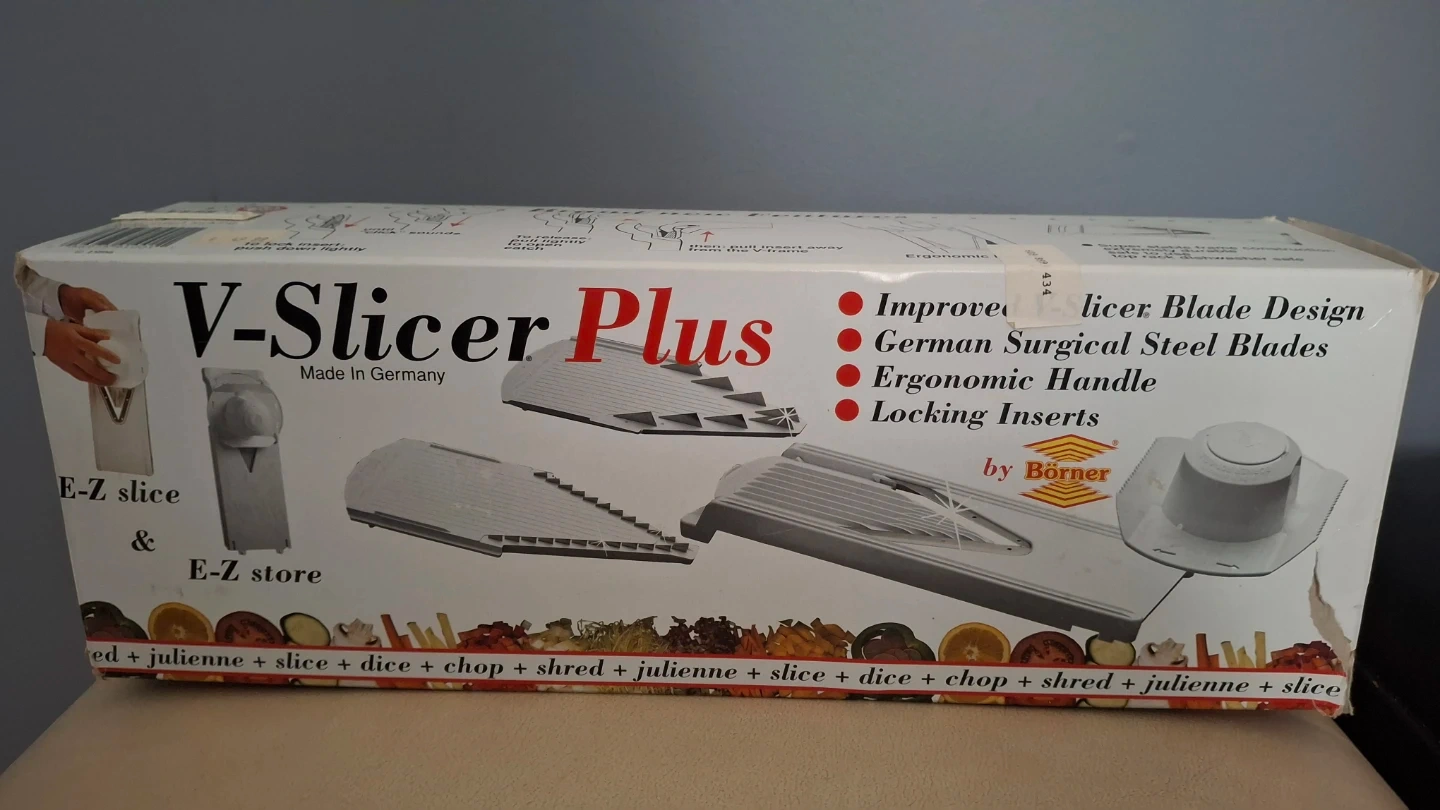 This V-Slicer Plus by Börner is made in Germany. It features German surgical steel blades and an ergonomic handle. Multiple slicing options are included.