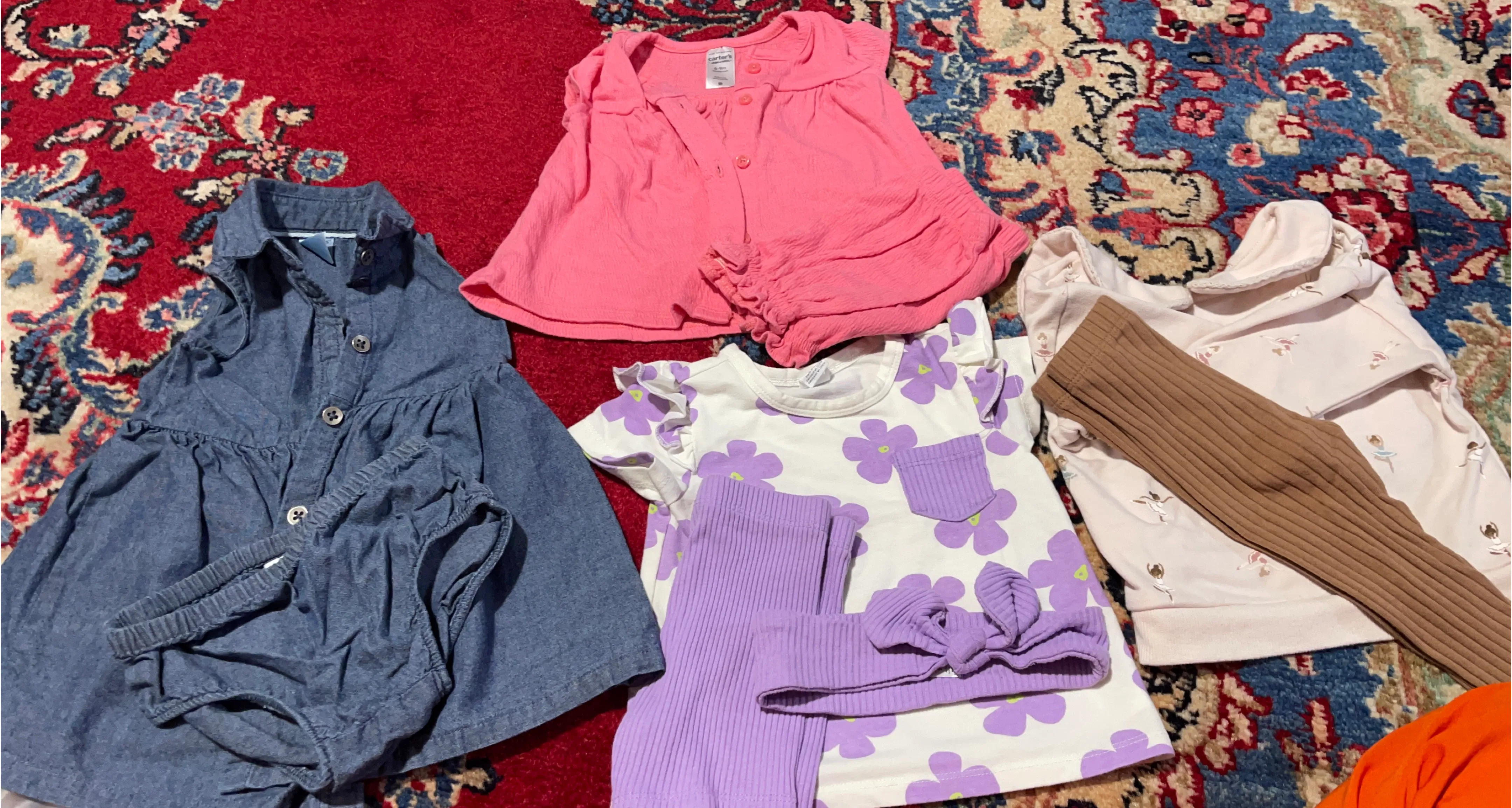 Selling a cute bundle of baby clothes from Carter's! Includes a denim dress with matching bloomers, a pink top, a floral top with matching leggings and headband, and a ballerina-themed top with brown leggings. All in great condition and ready for a new home