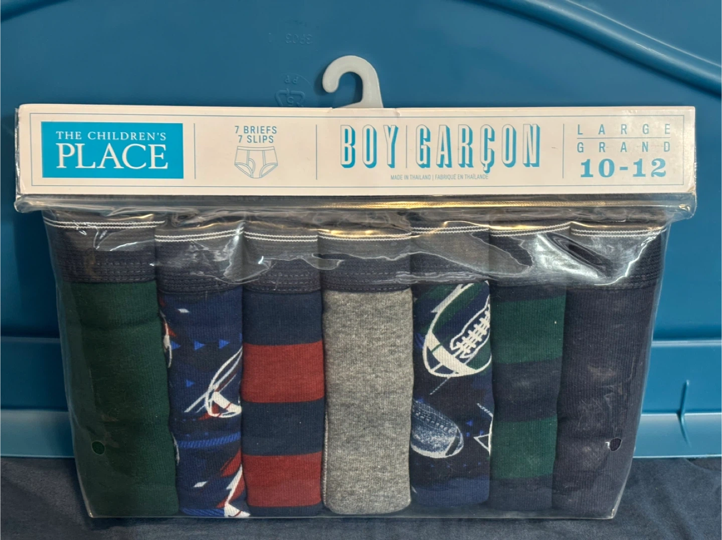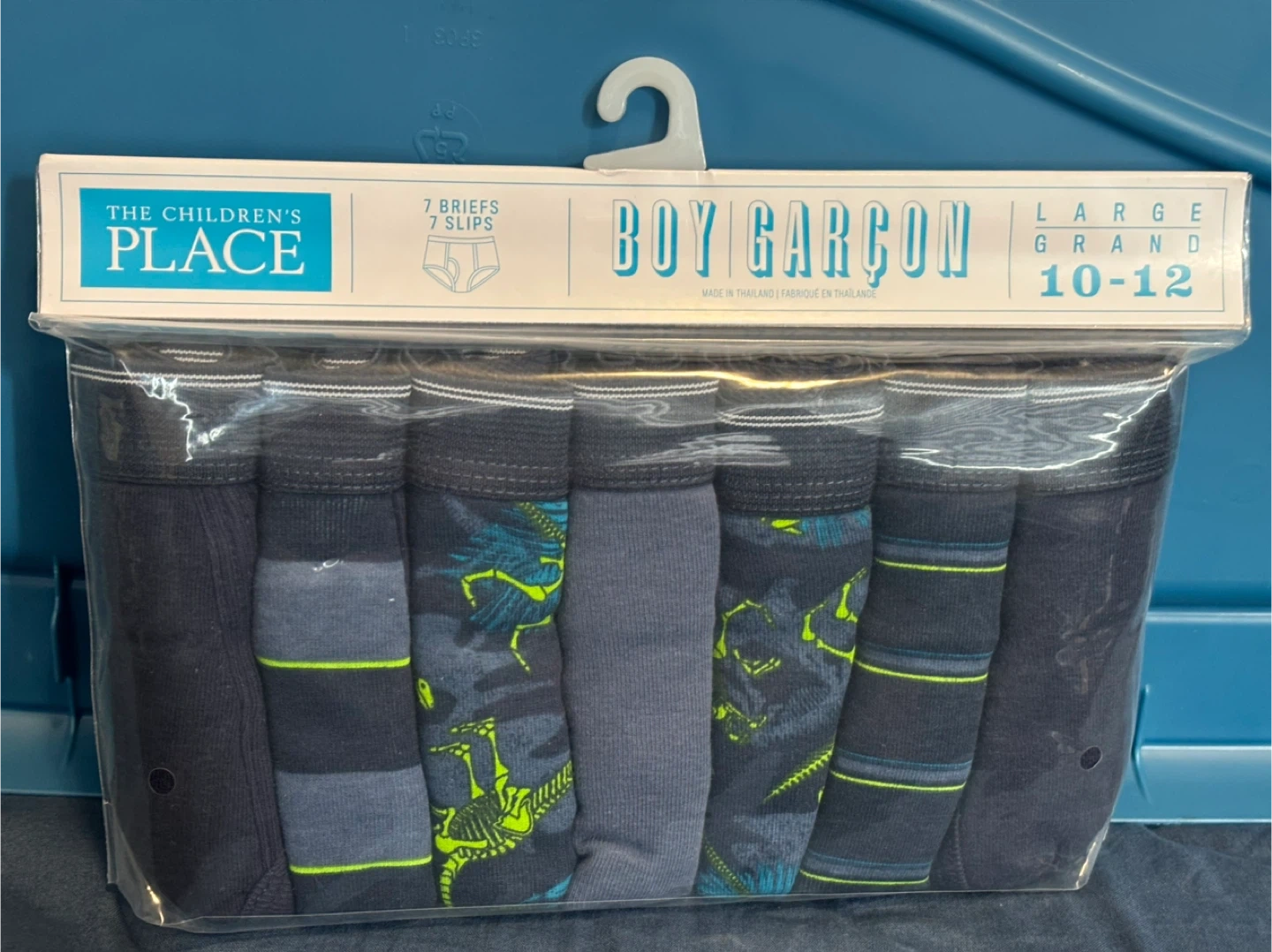 This pack includes seven boy's briefs from The Children's Place. They're a size large, fitting sizes 10-12. Made in Thailand.