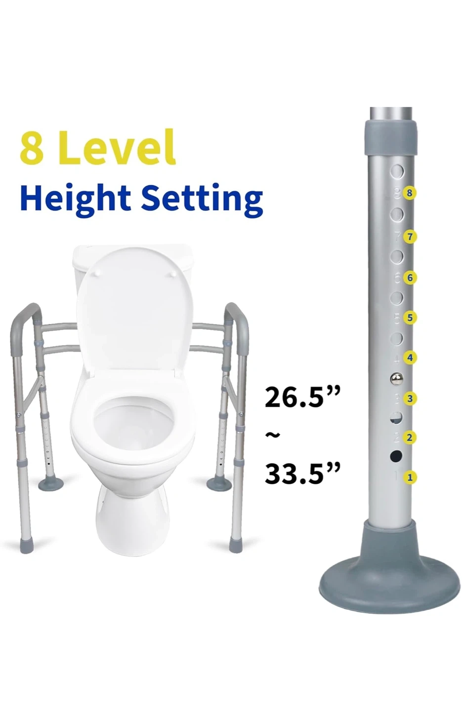 Adjustable toilet safety rails designed for elderly adults, seniors, and the handicap. Features 6 levels of width adjustment (20.5"-25.5") and 8 levels of height setting (26.5"-33.5"). Sturdy aluminum construction provides reliable support. These rails are suitable for most standard toilets and more shapes of people, offering assistance and stability.