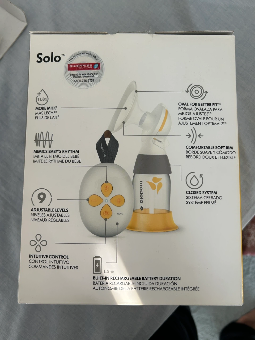This Medela Solo single electric breast pump offers intuitive control and 9 adjustable levels. It features a built-in rechargeable battery with 1.5 hours of duration. Includes one 5 oz/150 ml bottle and PersonalFit Flex shield.