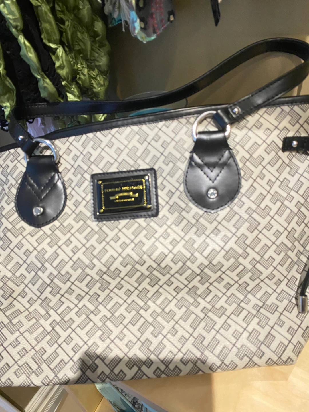This is a classic Tommy Hilfiger tote bag. It features the signature Tommy Hilfiger monogram pattern. The interior has a zippered pocket for secure storage. This bag is perfect for everyday use!