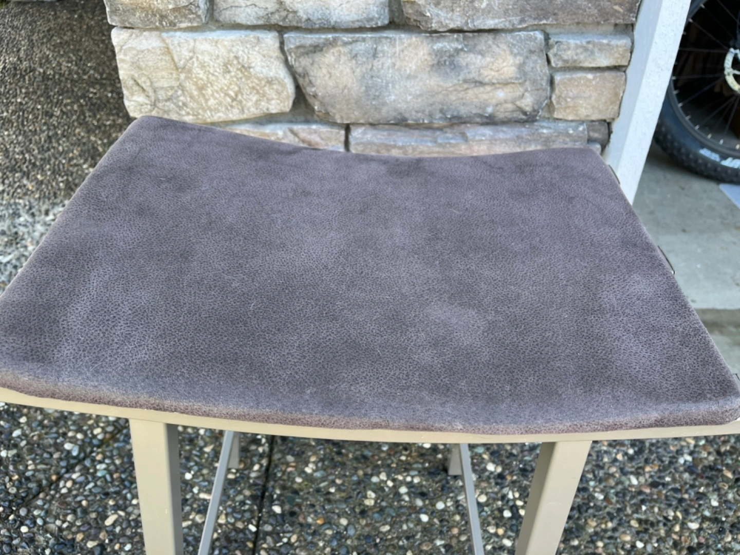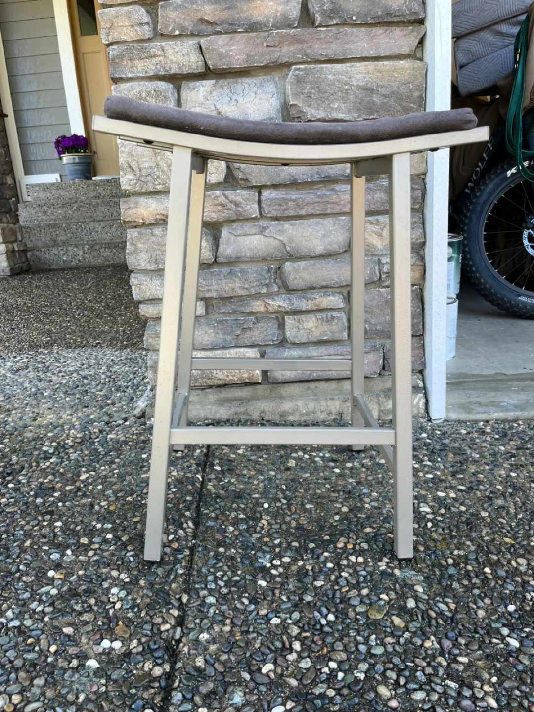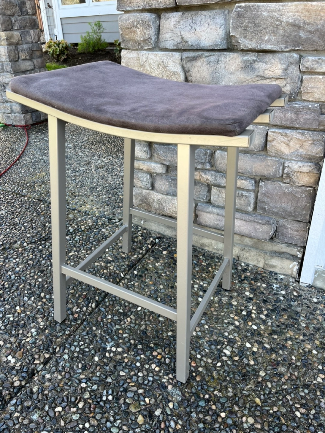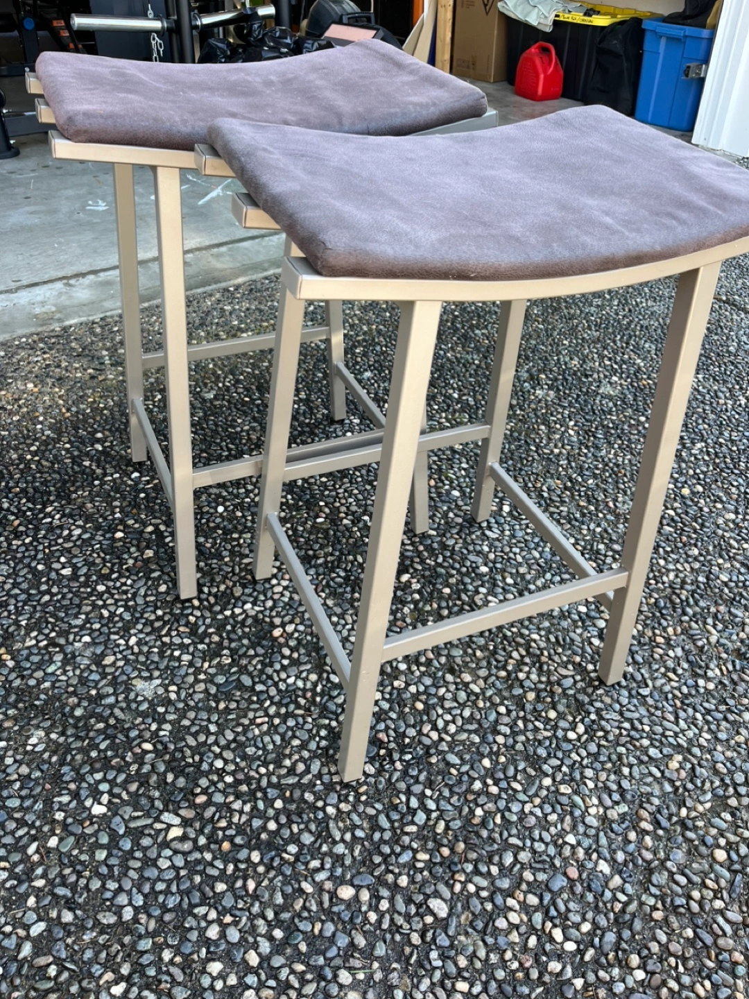 Two contemporary bar stools. Metal frame, cushioned seats. Neutral colours. Good condition. Approximately 24 inches tall.