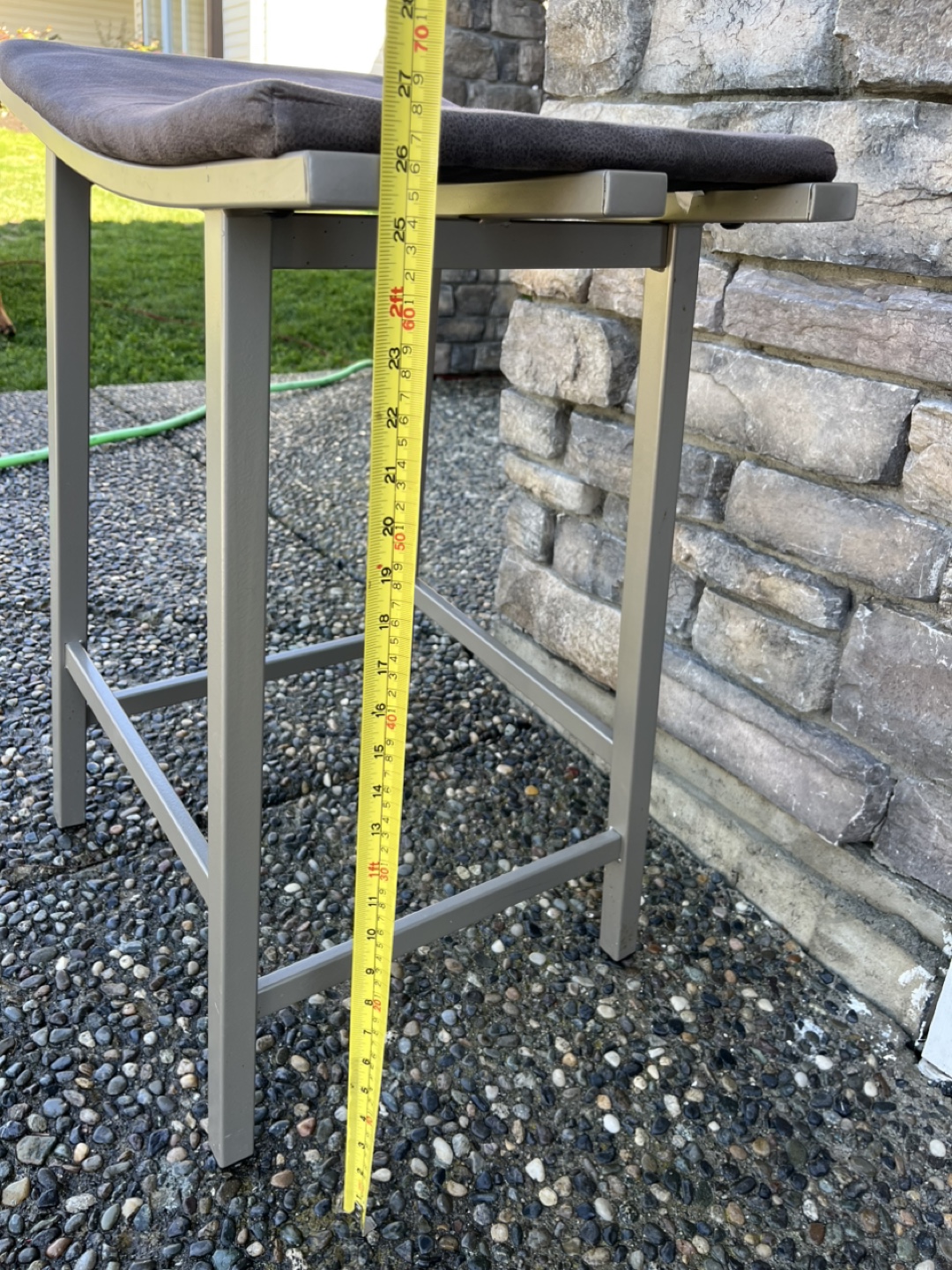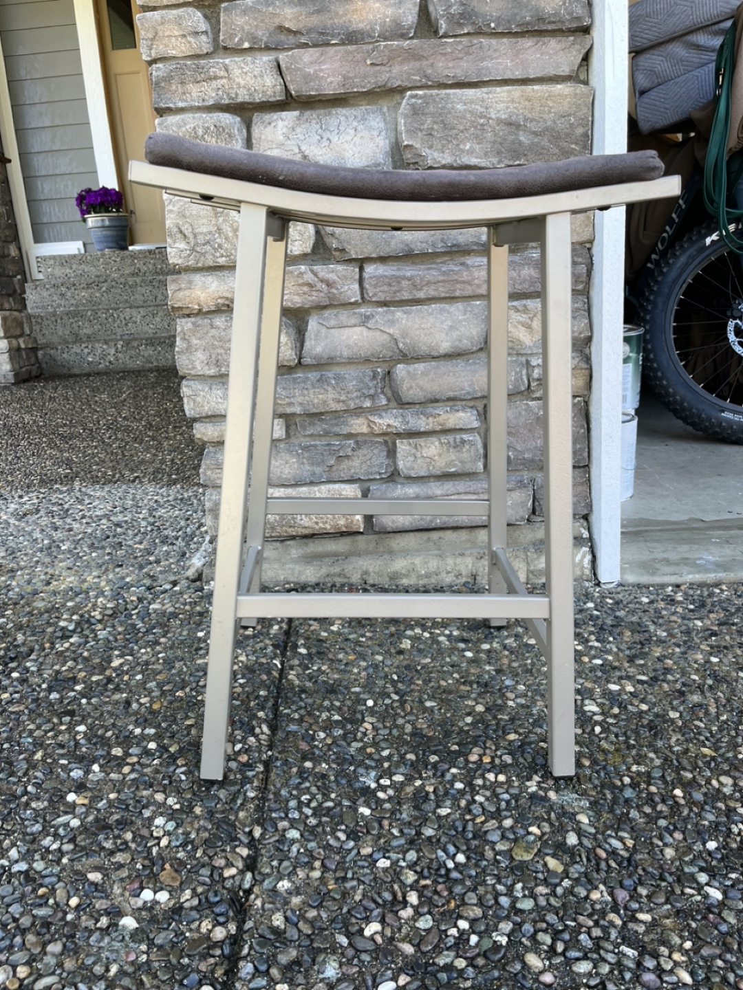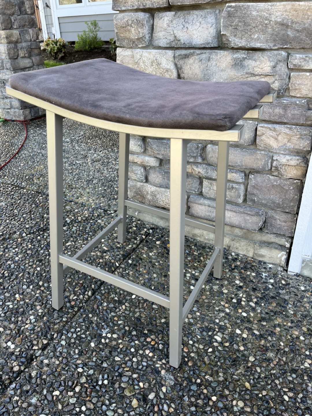 Two contemporary bar stools. Metal frame, cushioned seats. Neutral colours. Good condition. Approximately 24 inches tall.