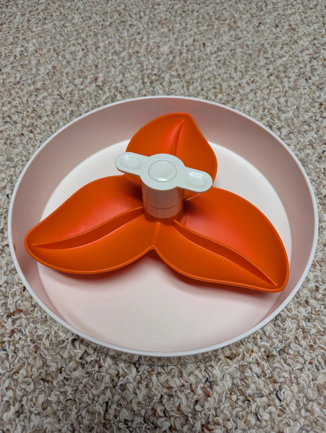 This is a pet water bowl designed to prevent spills. It features a floating disk that slows down drinking. Made of durable plastic material. Easy to clean.