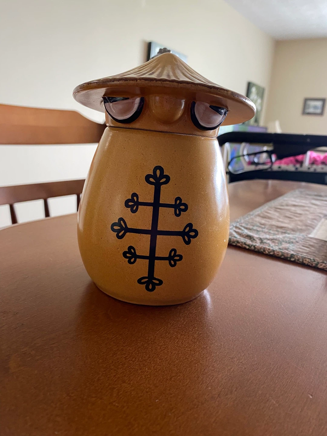 This is a beer stein with a whimsical character design and a straw-like hat. It features a distinctive cross emblem on the front. Its playful design makes it a fun decorative piece for your collection