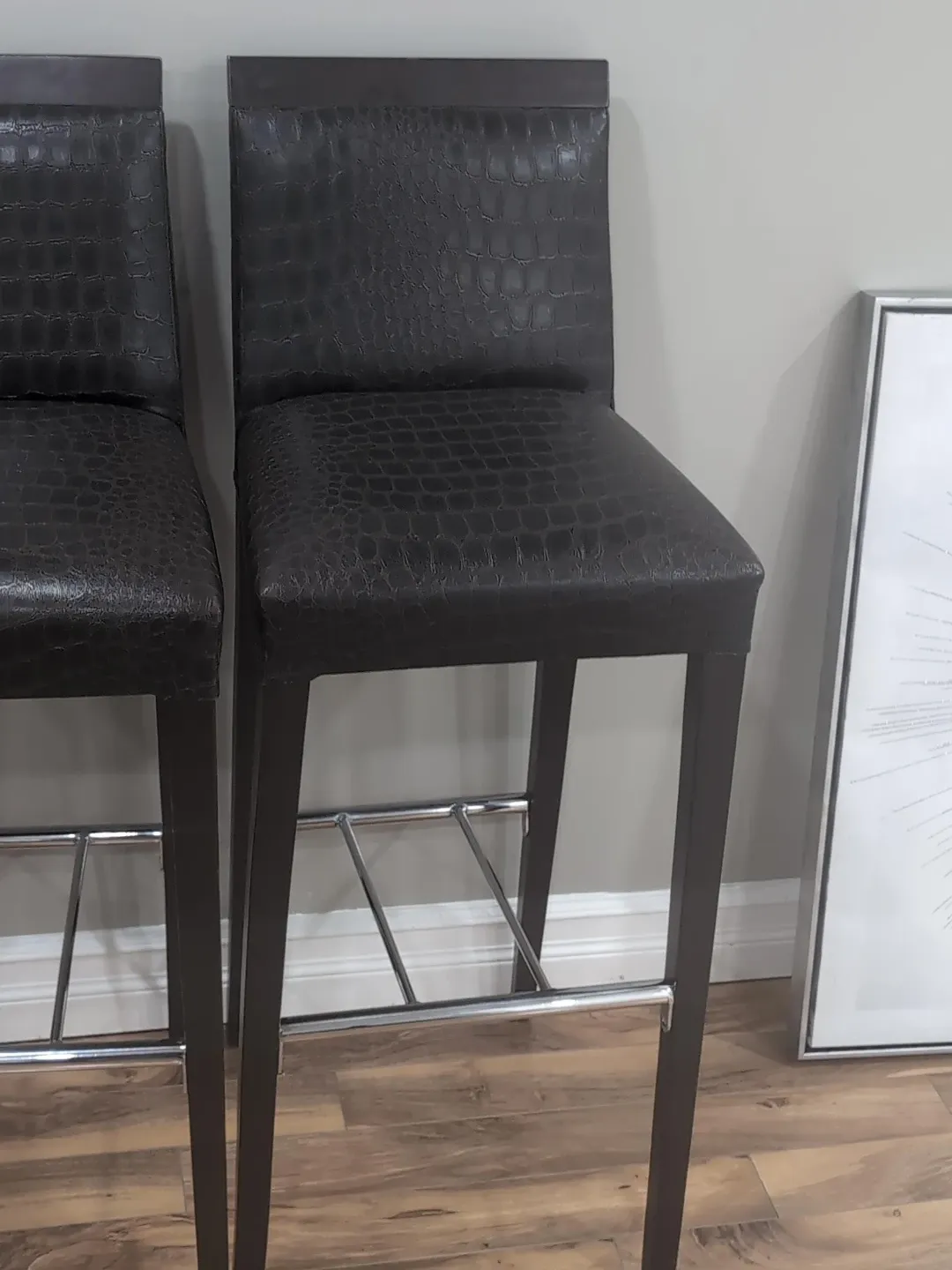 Selling two dark brown bar stools with a faux crocodile texture on the seat and back. They have wooden frames and chrome footrests. These stools would be a stylish addition to any kitchen island or home bar!