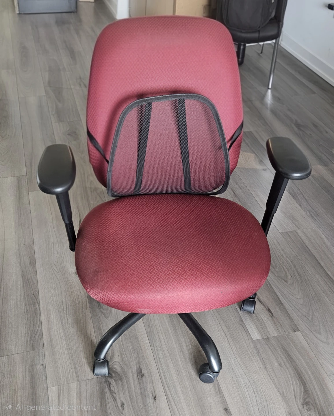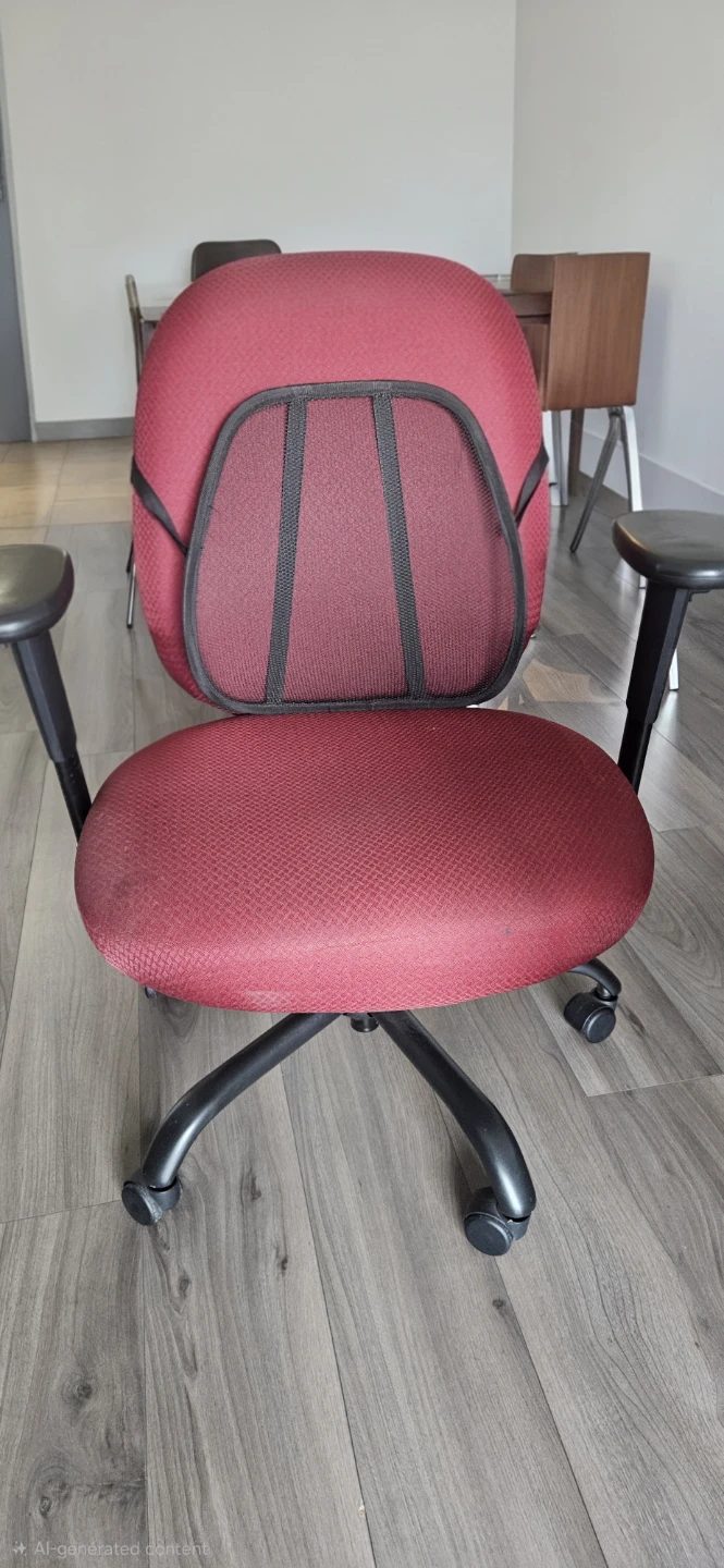 This is a red office chair with a mesh lumbar support. It has adjustable armrests and a five-wheel base for easy mobility. The upholstery is a durable fabric.