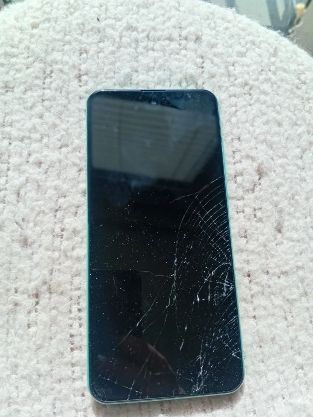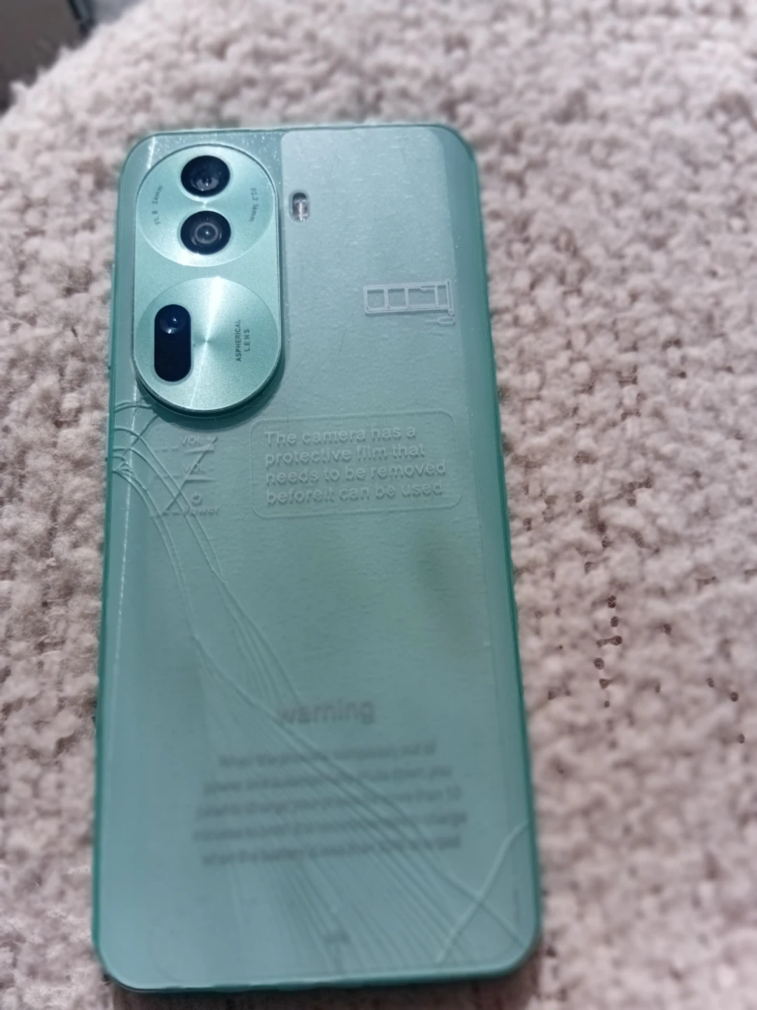 This is a green smartphone. The screen is cracked. The camera has a protective film that needs to be removed before use.