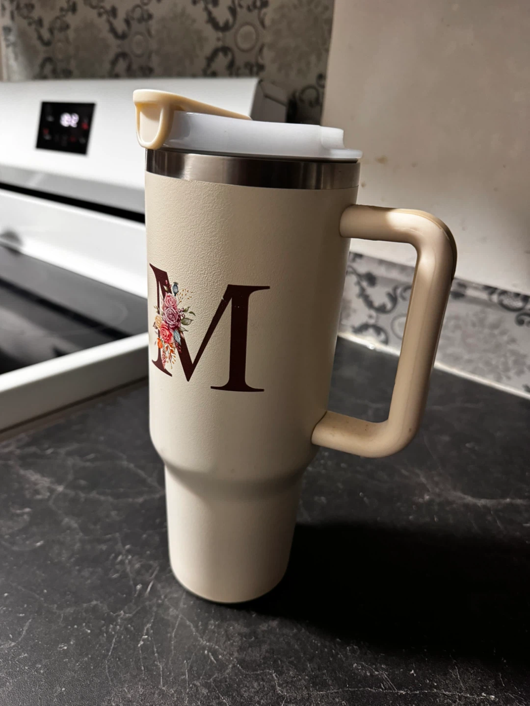 Cream Insulated Tumbler with Handle and 'M' Initial