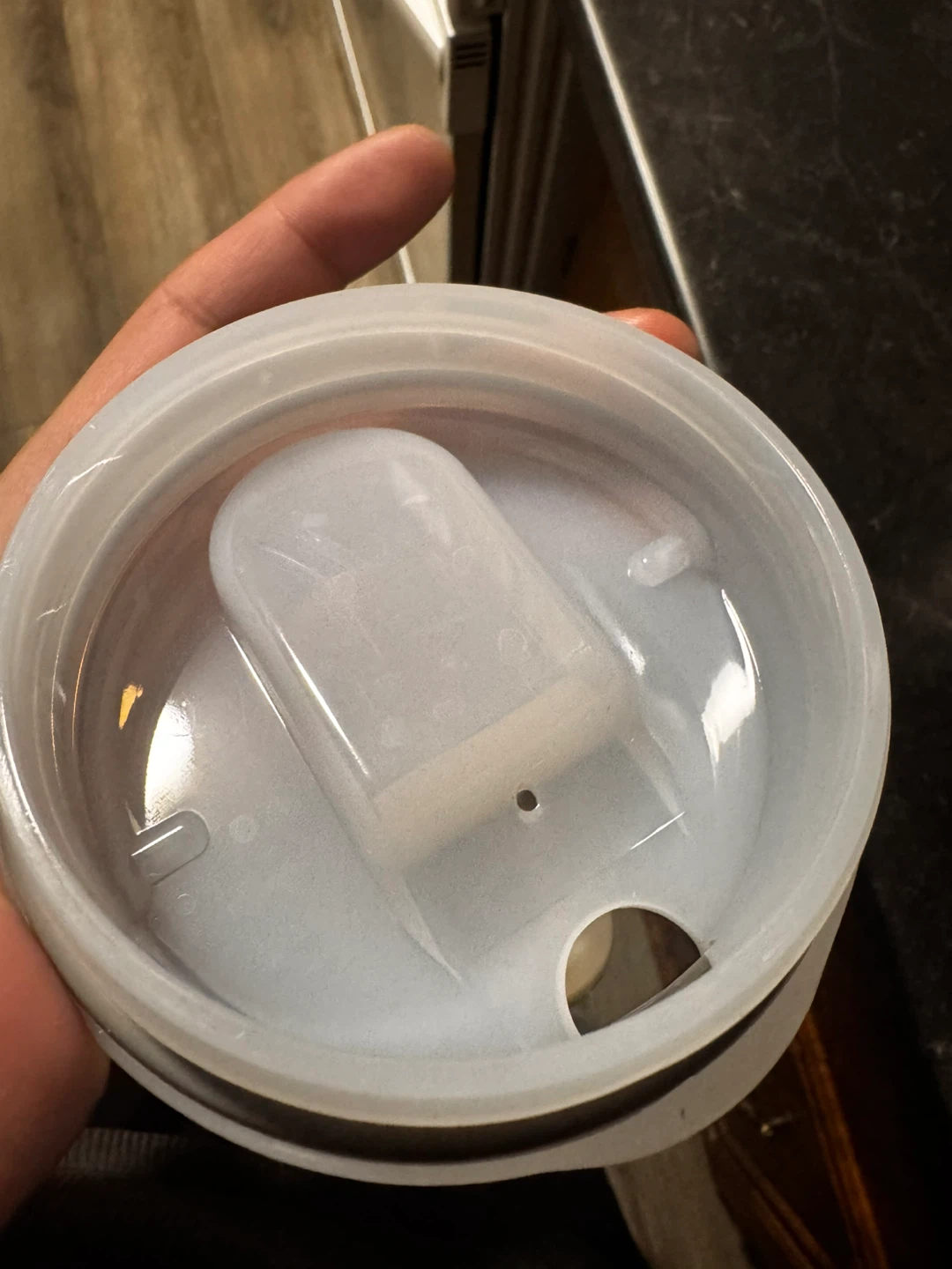 Cream insulated tumbler with a handle. Features a sliding lid for easy sipping. Stainless steel construction. Approximately 30oz capacity.