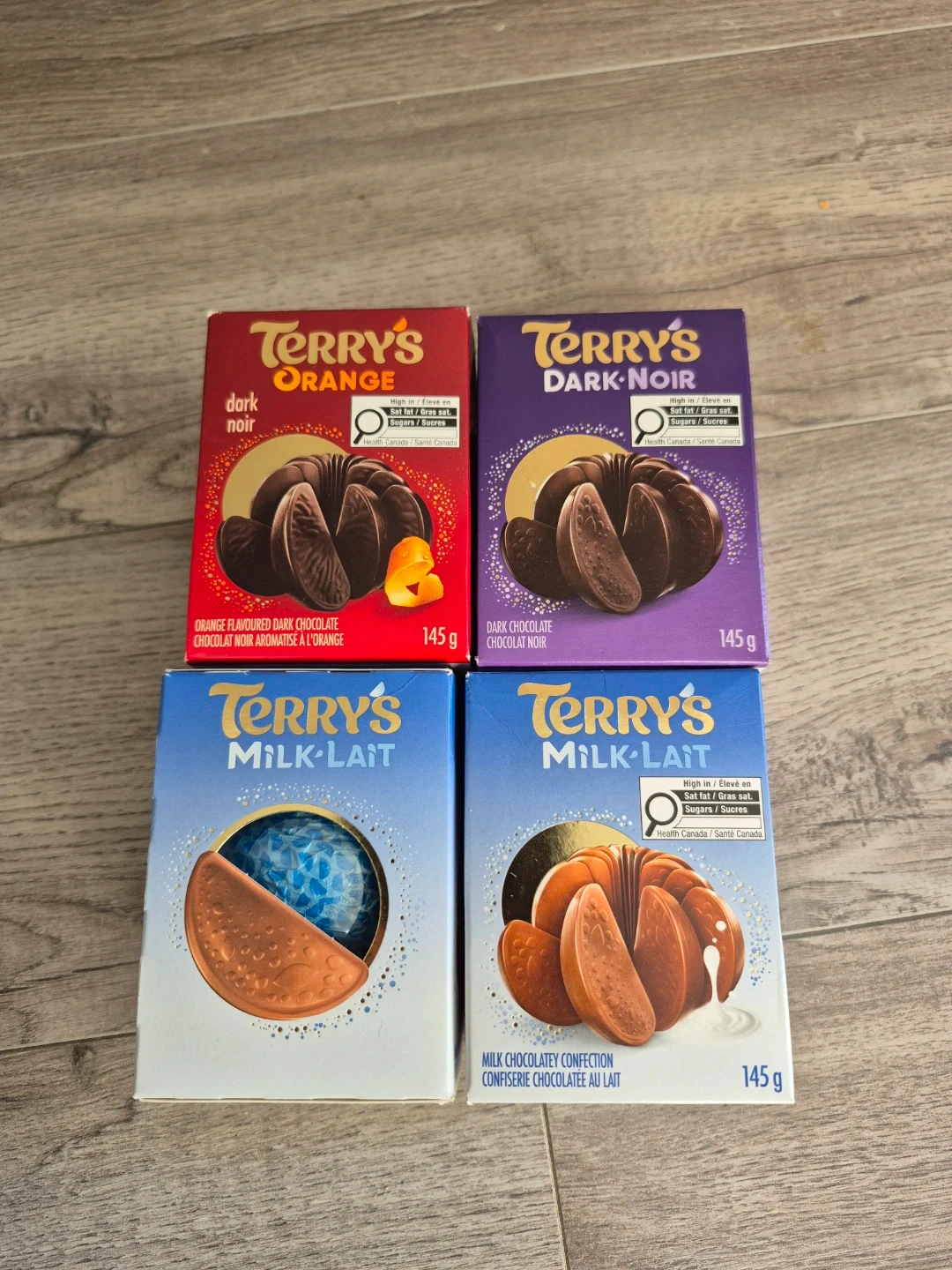 A selection of Terry's chocolate treats including milk chocolate with orange flavour and dark chocolate with orange flavour. Also includes plain milk chocolate and dark chocolate options. Each box contains 145g.