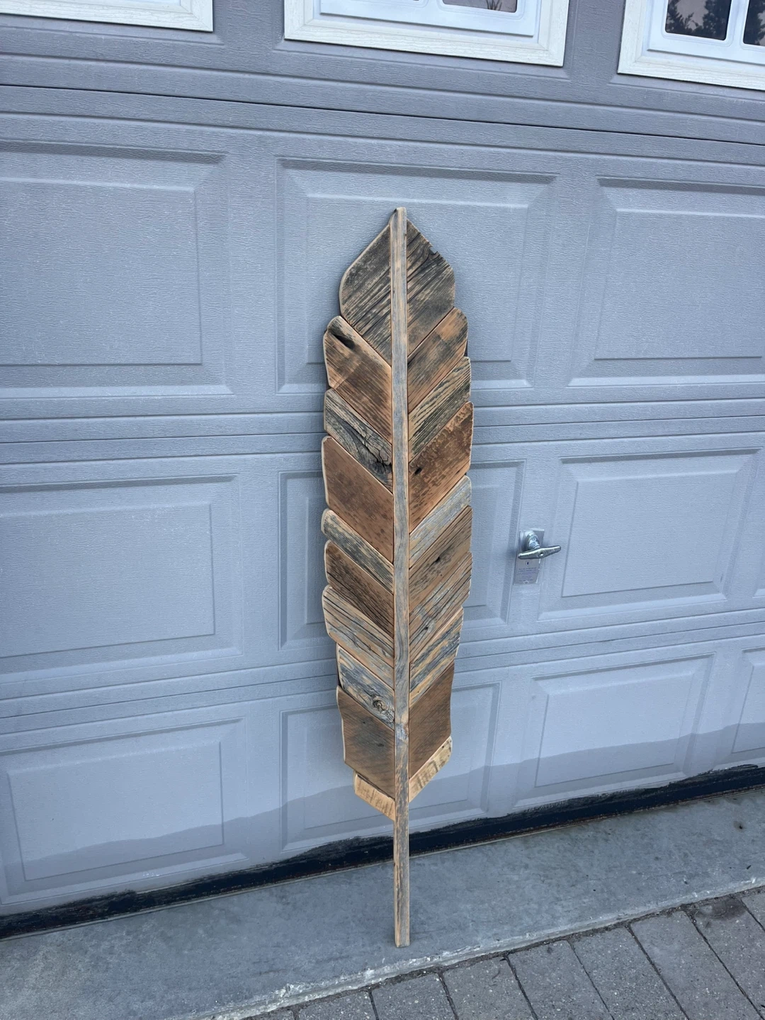 Handcrafted Barn Board Feather. All made from locally sourced reclaimed barn boards. Great for home or cottage. Awesome conversation piece. Can be hung inside or outside. I’m a local artist located in Thornton Ontario. Size is 4 feet 10.5 inches tall by 11 inches wide. Have 2 available. Can deliver within reasonable distance.