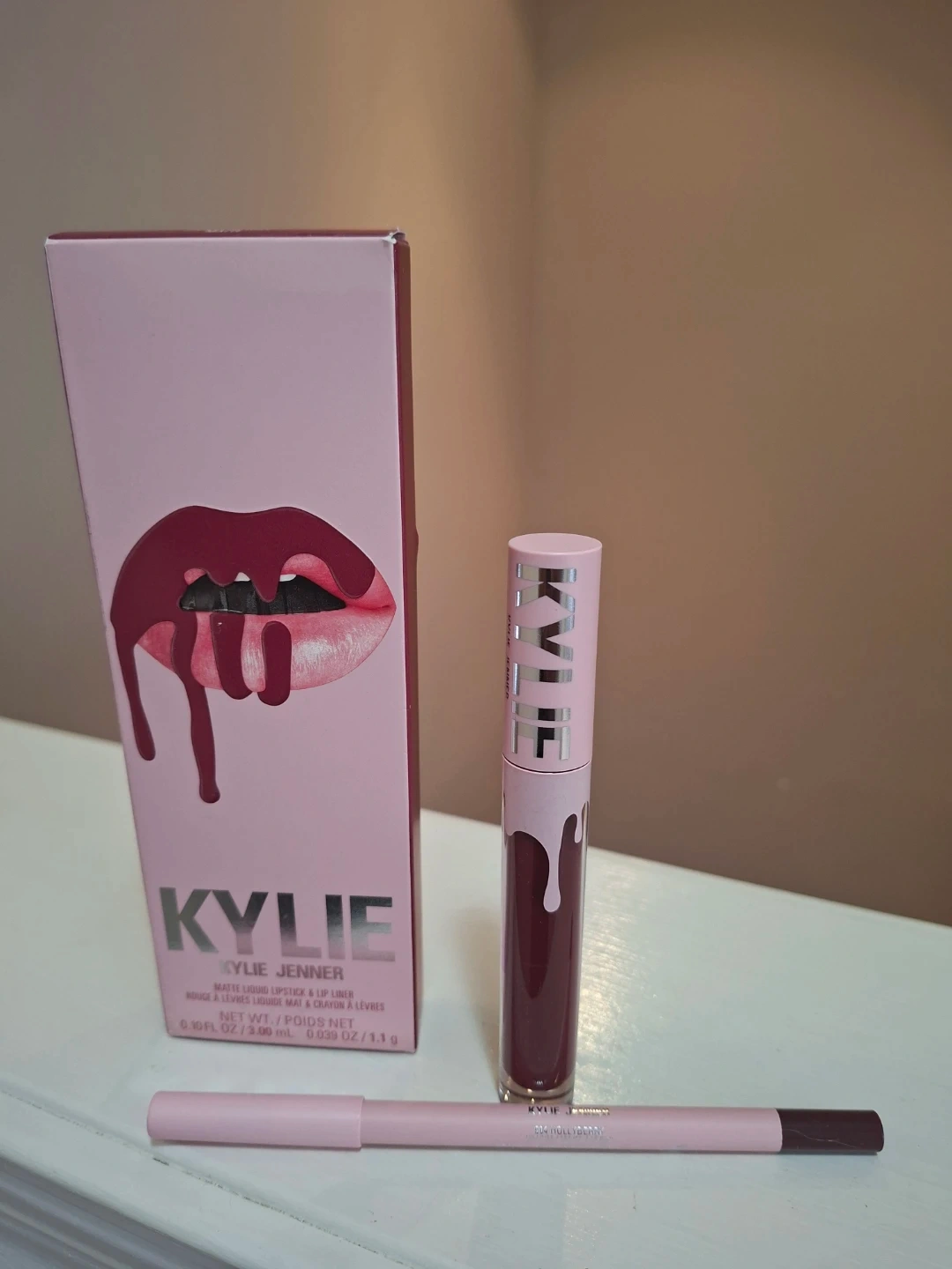 Kylie Jenner matte liquid lipstick and lip liner kit in shade 504 Hollyberry. This set includes the matte liquid lipstick and a matching lip liner. The formula is matte.