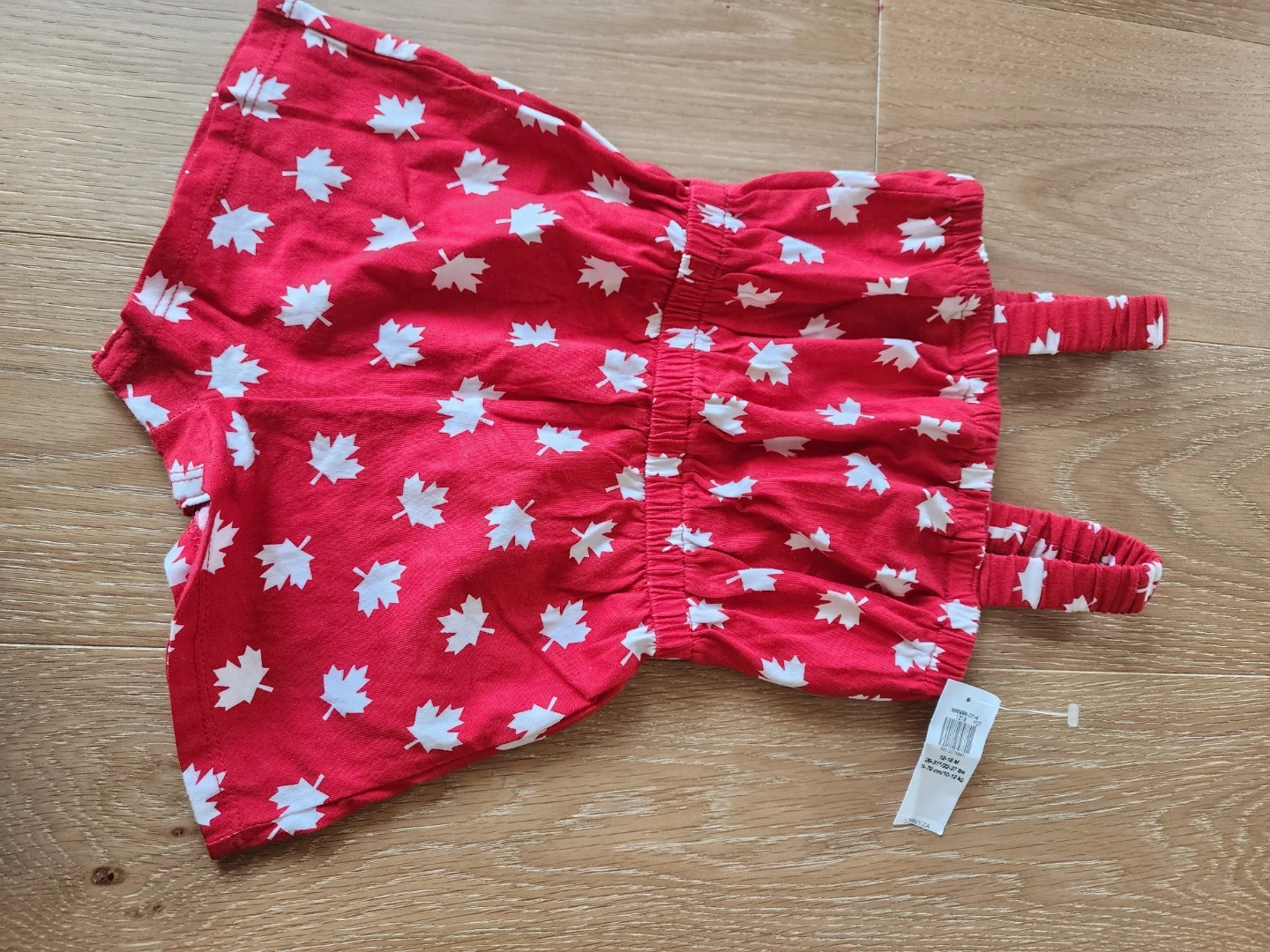 This Old Navy dress is brand new with tags! It's red with a white maple leaf pattern and is size 12-18 months. It fits babies weighing 22-27 lbs or 10-12 kg and who are 74-79 cm tall
