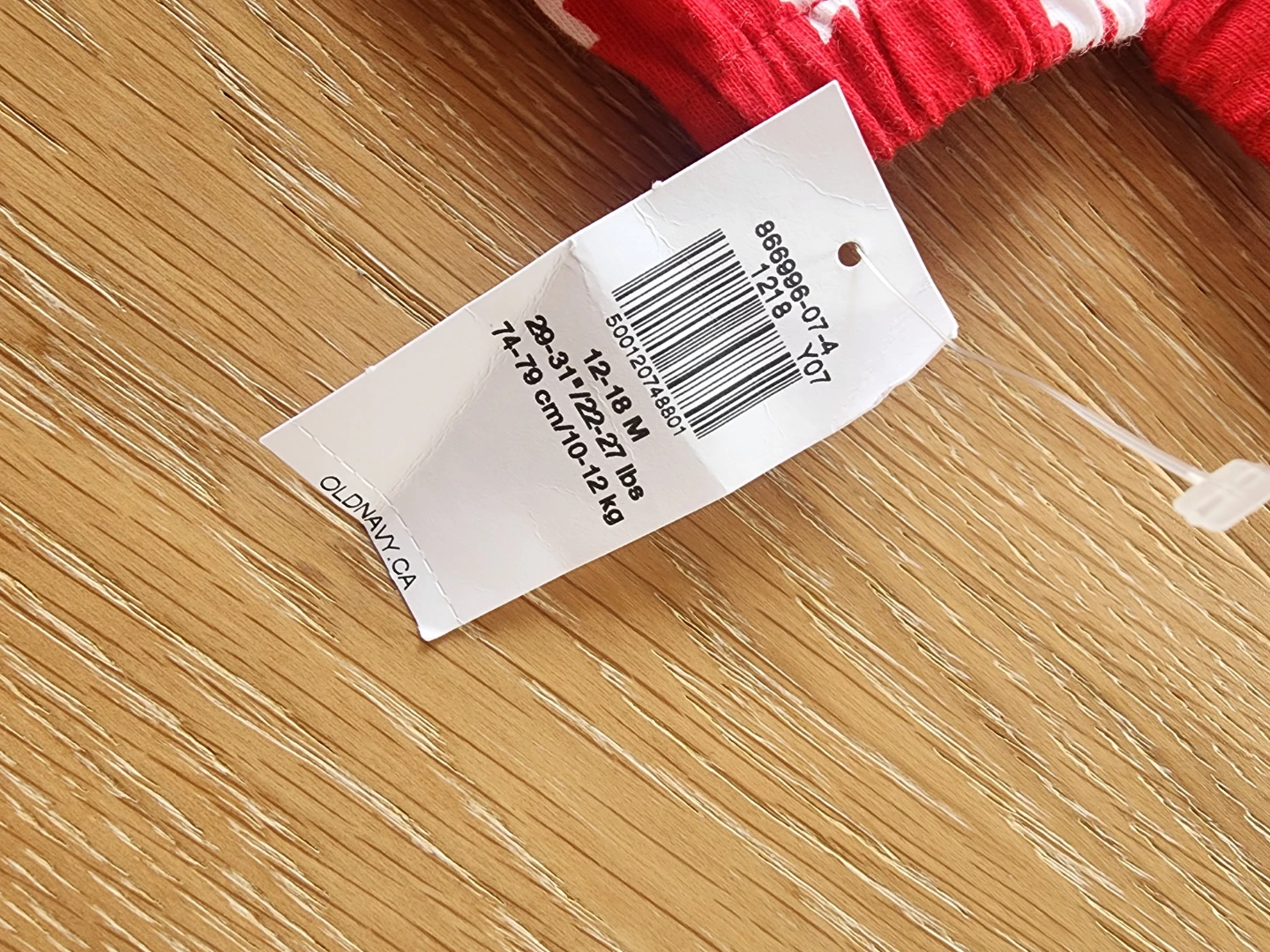 This Old Navy dress is brand new with tags! It's red with a white maple leaf pattern and is size 12-18 months. It fits babies weighing 22-27 lbs or 10-12 kg and who are 74-79 cm tall