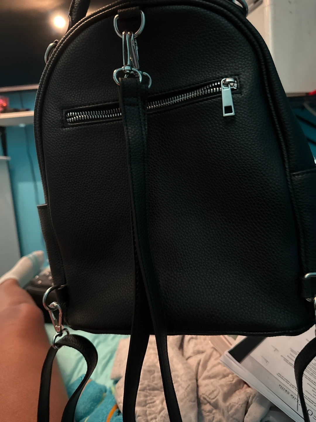 Selling a cute black mini backpack! It's in great condition and perfect for carrying essentials. The backpack features a main compartment with a zipper closure and a front pocket for easy access to smaller items. The straps are adjustable for a comfortable fit