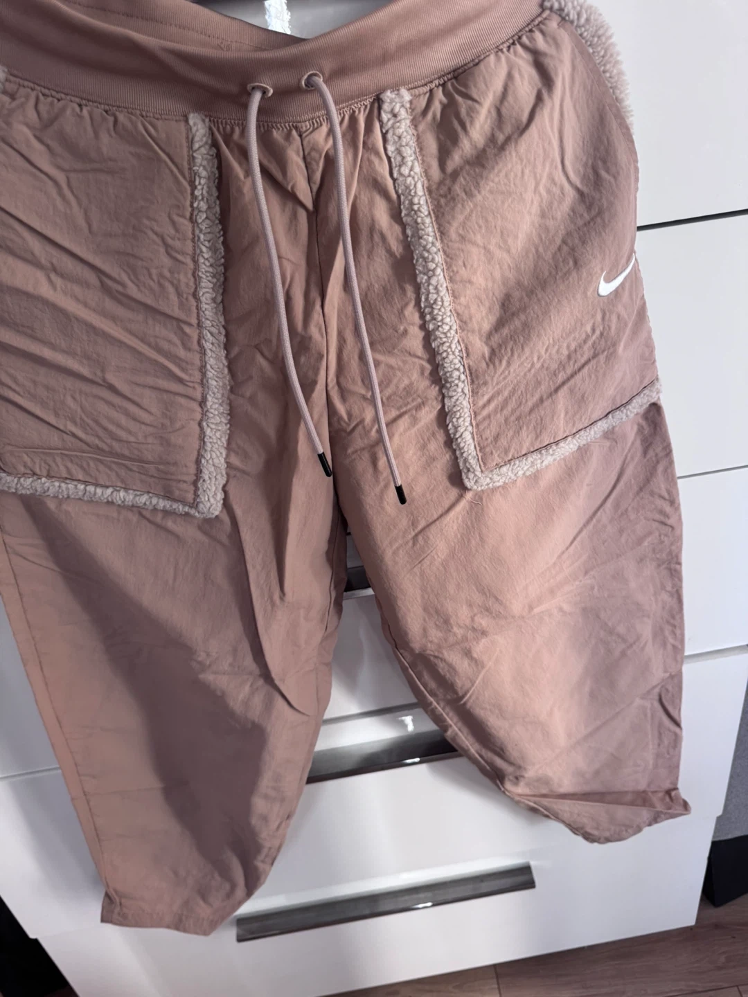 These Nike joggers are size medium and feature a light pink colour. They're made with a durable fabric and have a comfortable elastic waistband. These pants are perfect for casual wear or light athletic activities.