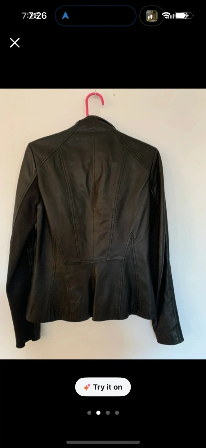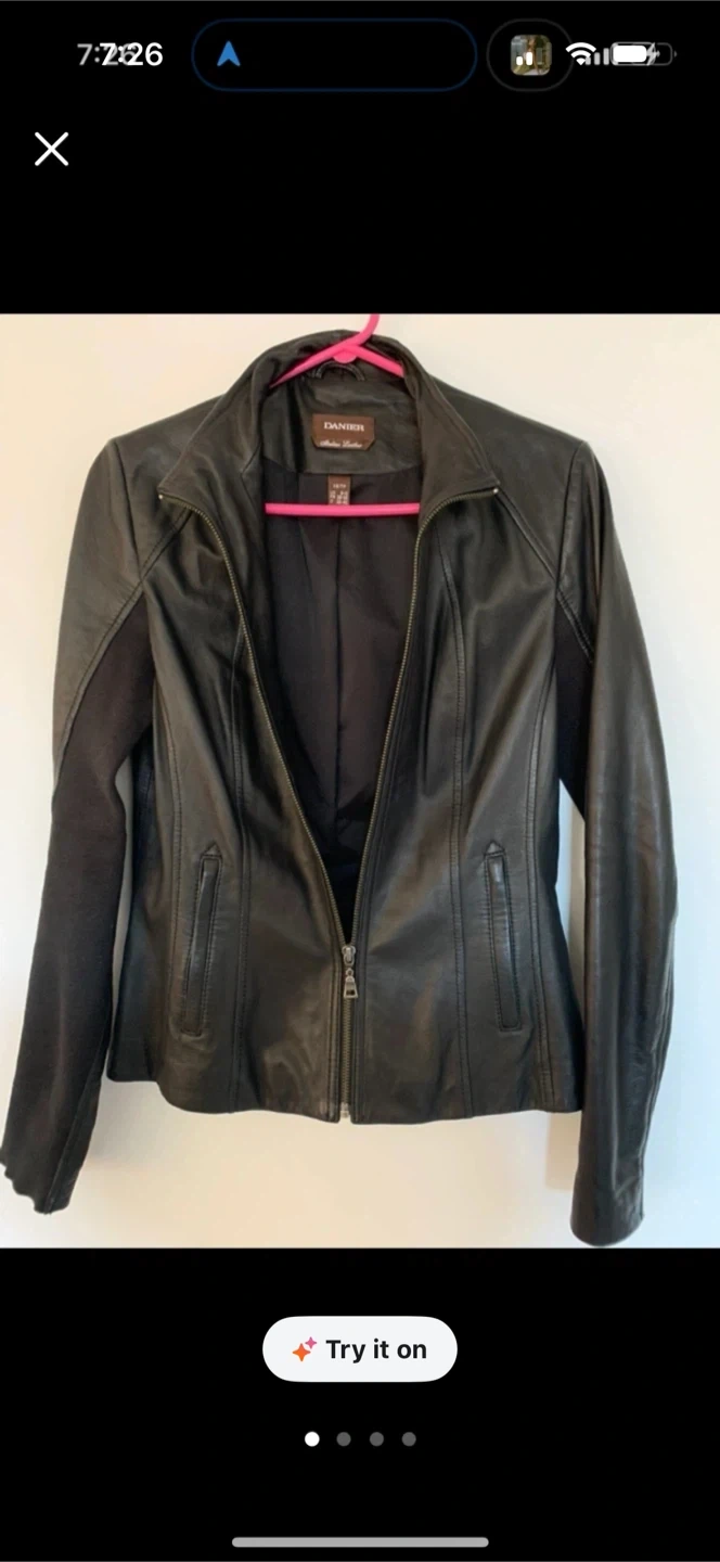 A stylish black leather jacket. It features a zip-up front and pockets. Made from leather.