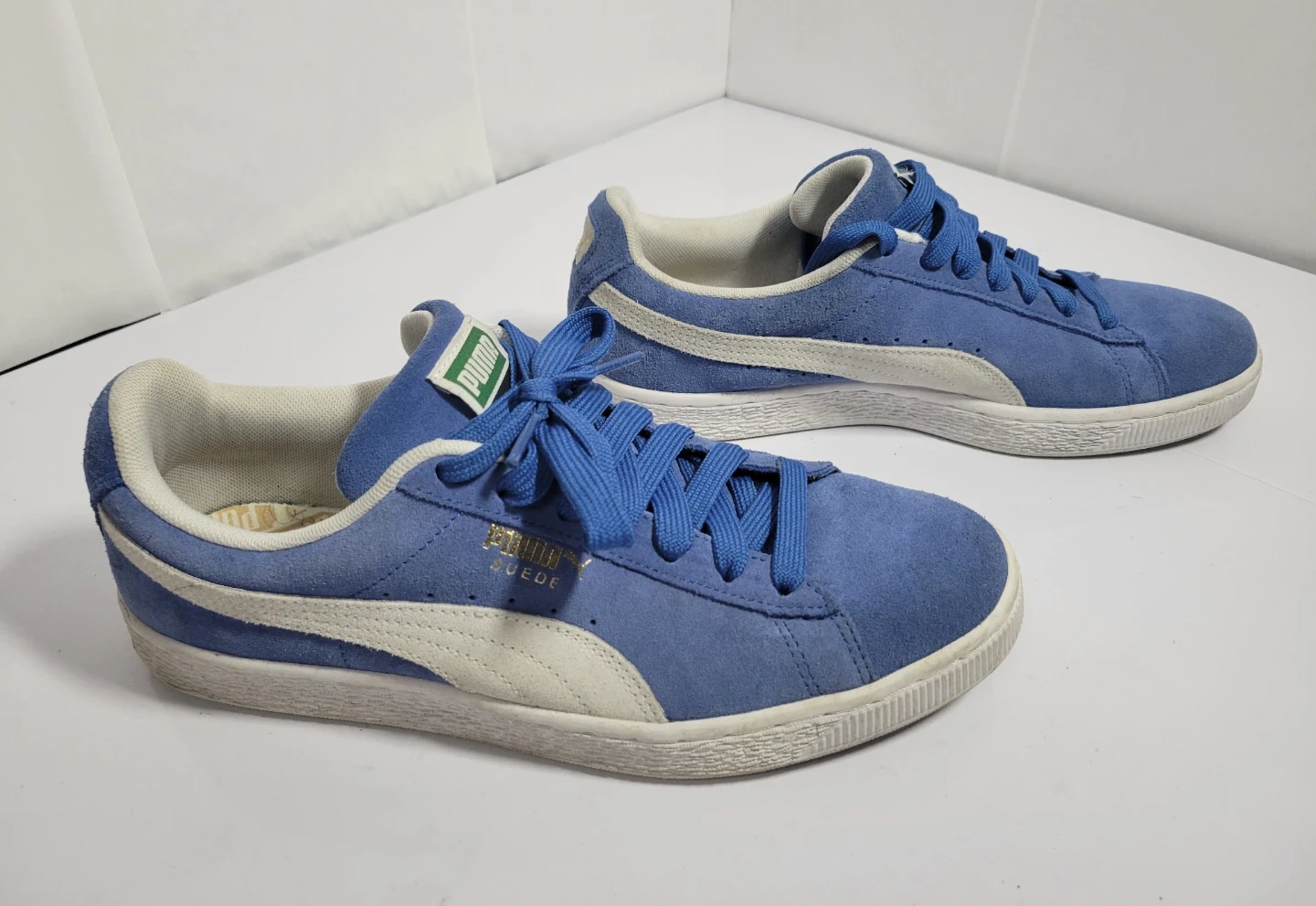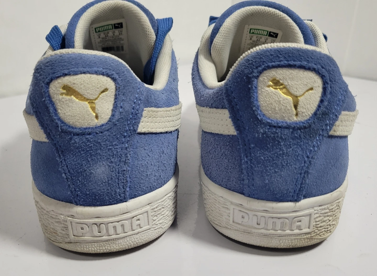 Blue Puma Suede Classic low-top sneakers. Lace-up closure with white rubber soles.