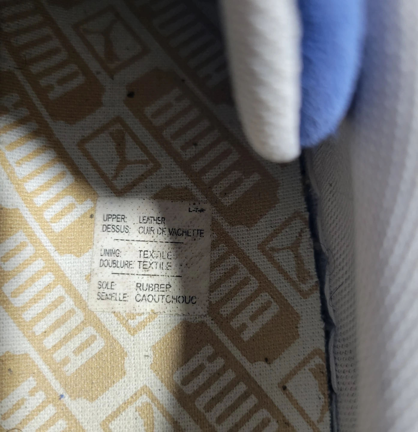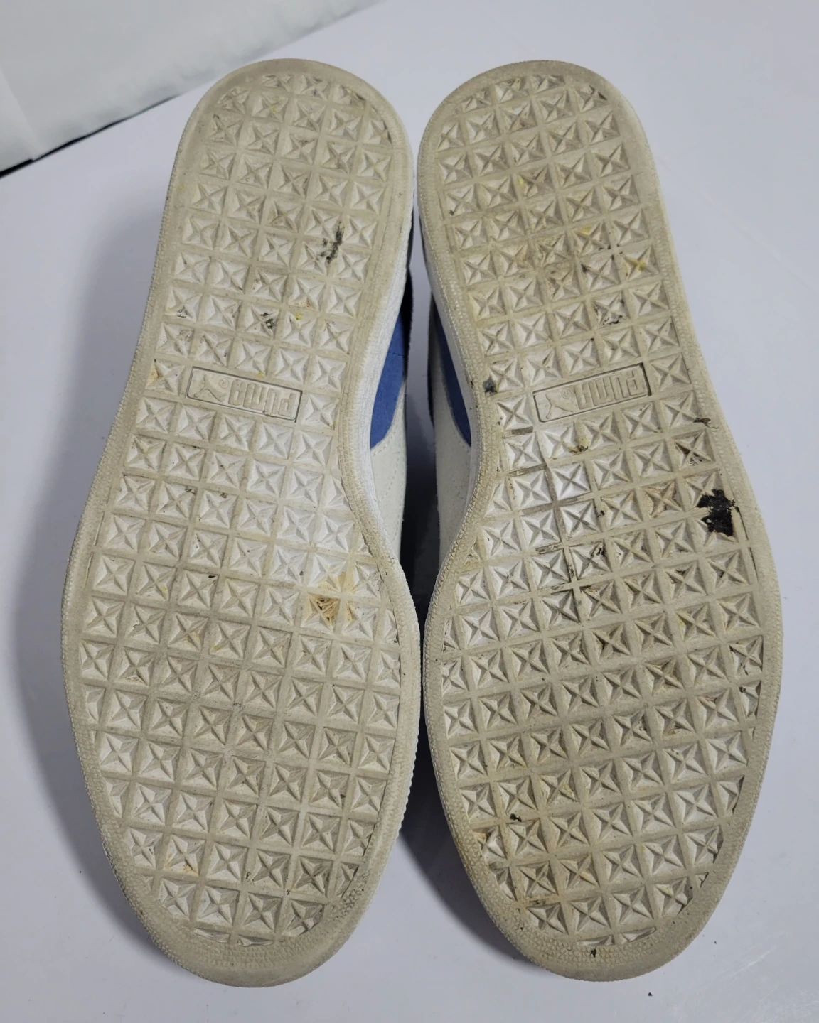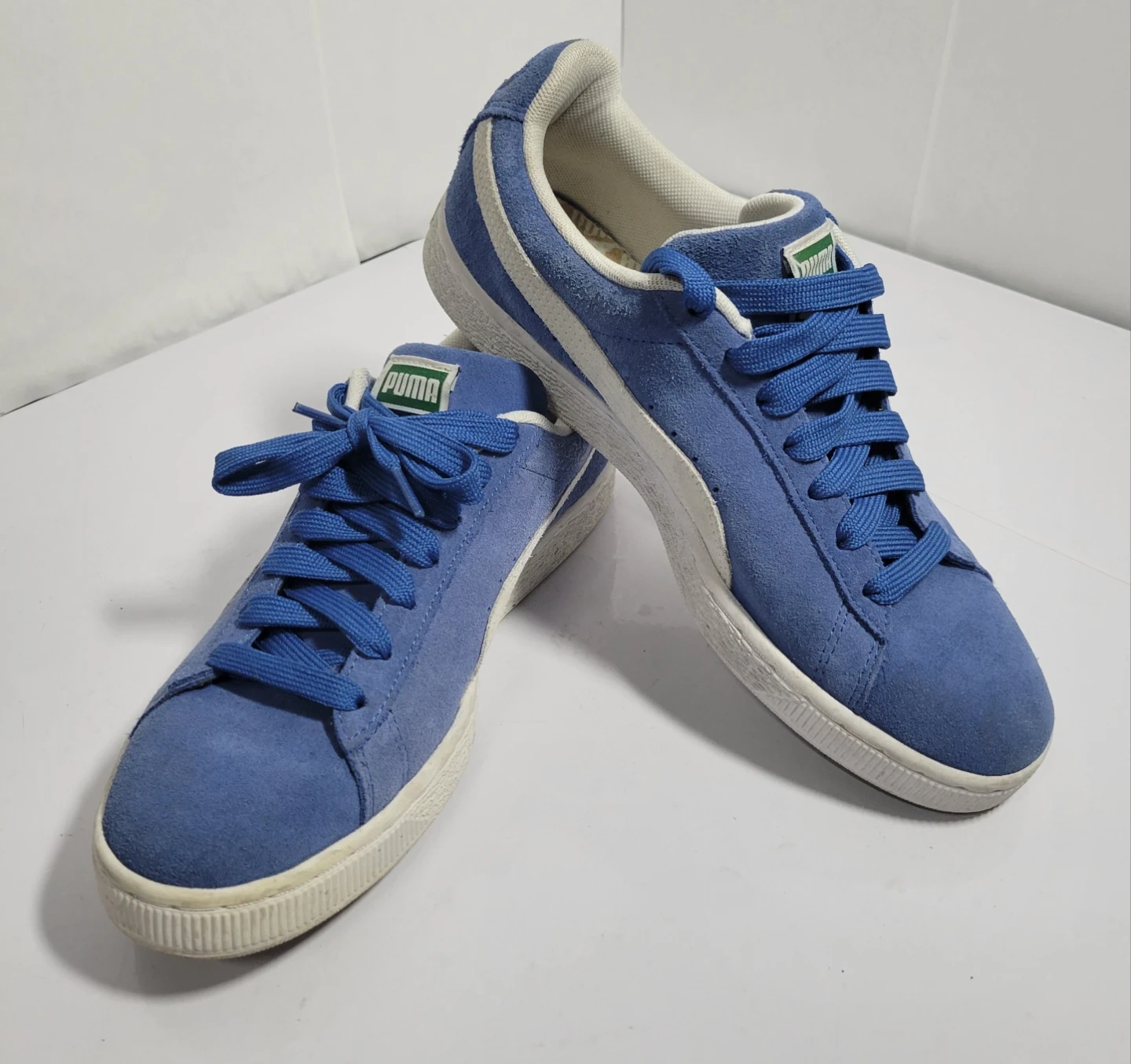 Blue Puma Suede Classic low-top sneakers. Lace-up closure with white rubber soles.