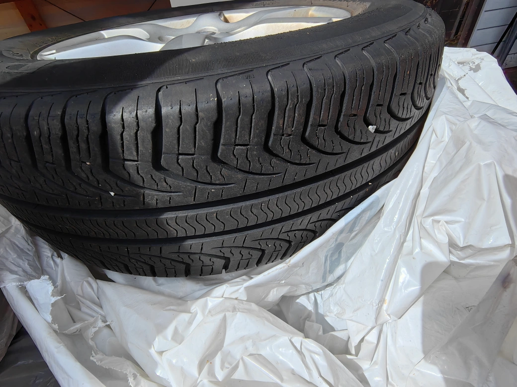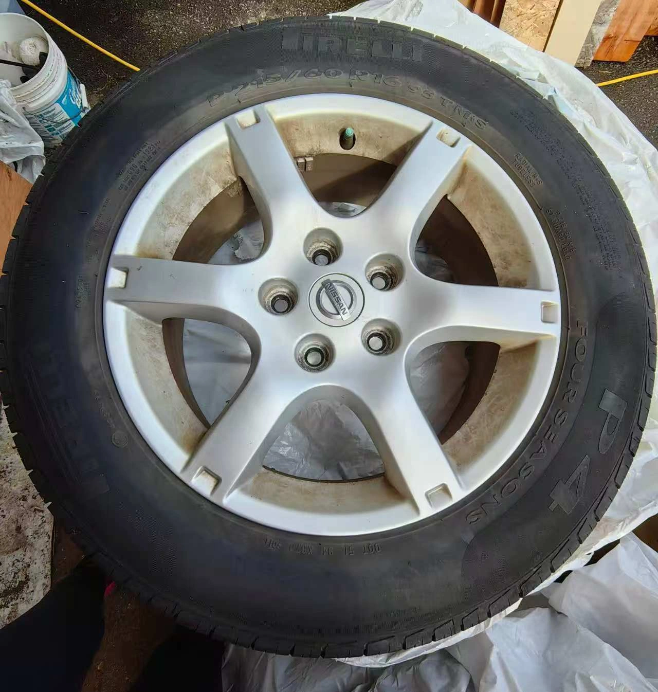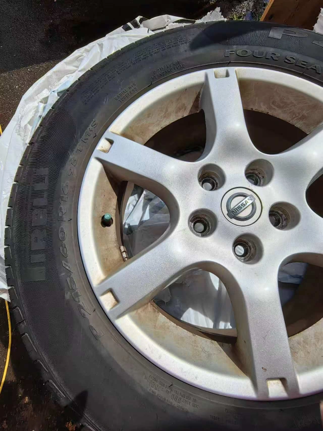 The tire shows some wear. The wheel is a silver color. There is a center cap with the Nissan logo. This item can get you safely down the road. NISSAN all-season tires, 4 sizes are shown on the tires, $250. Very new.