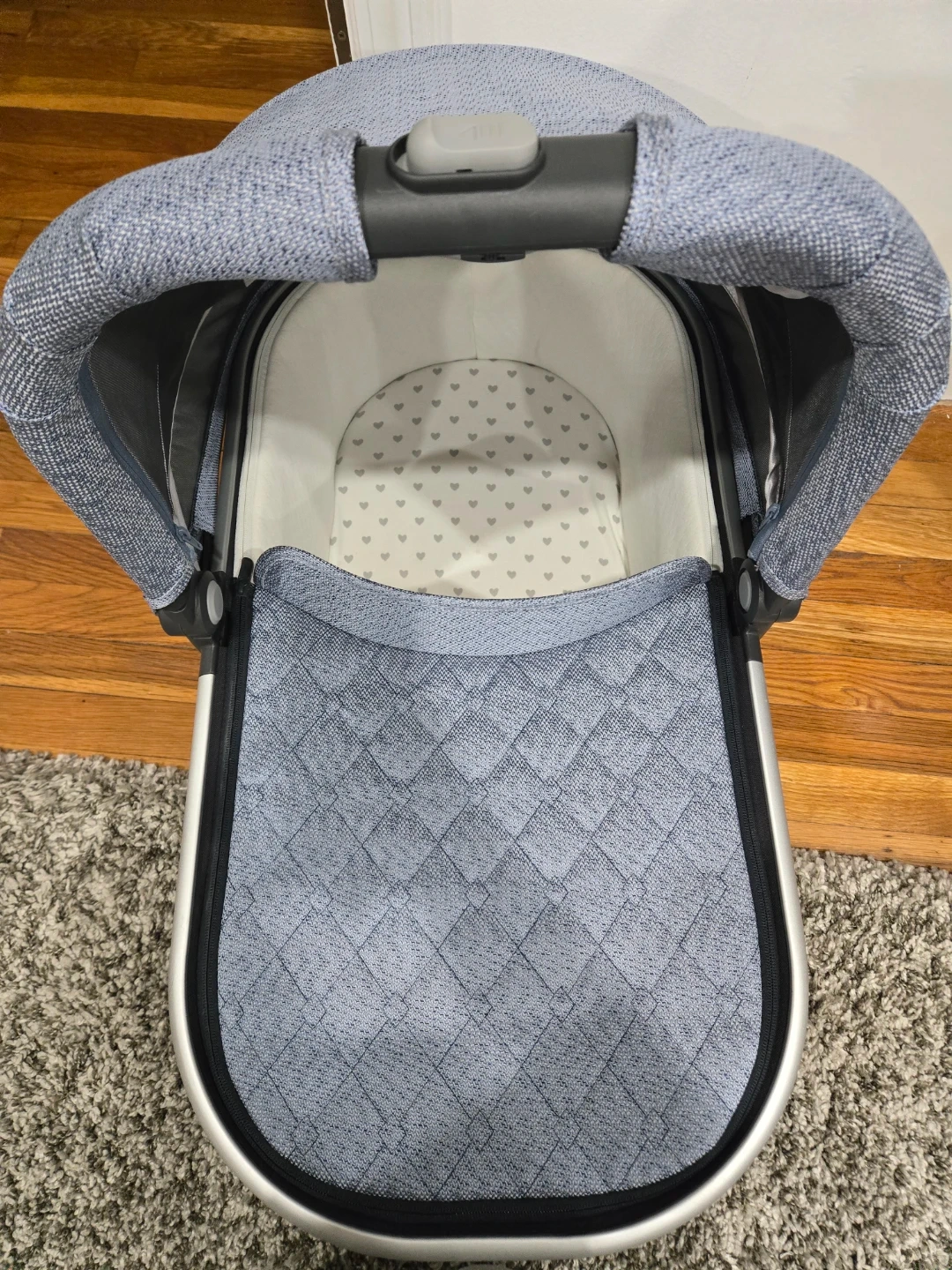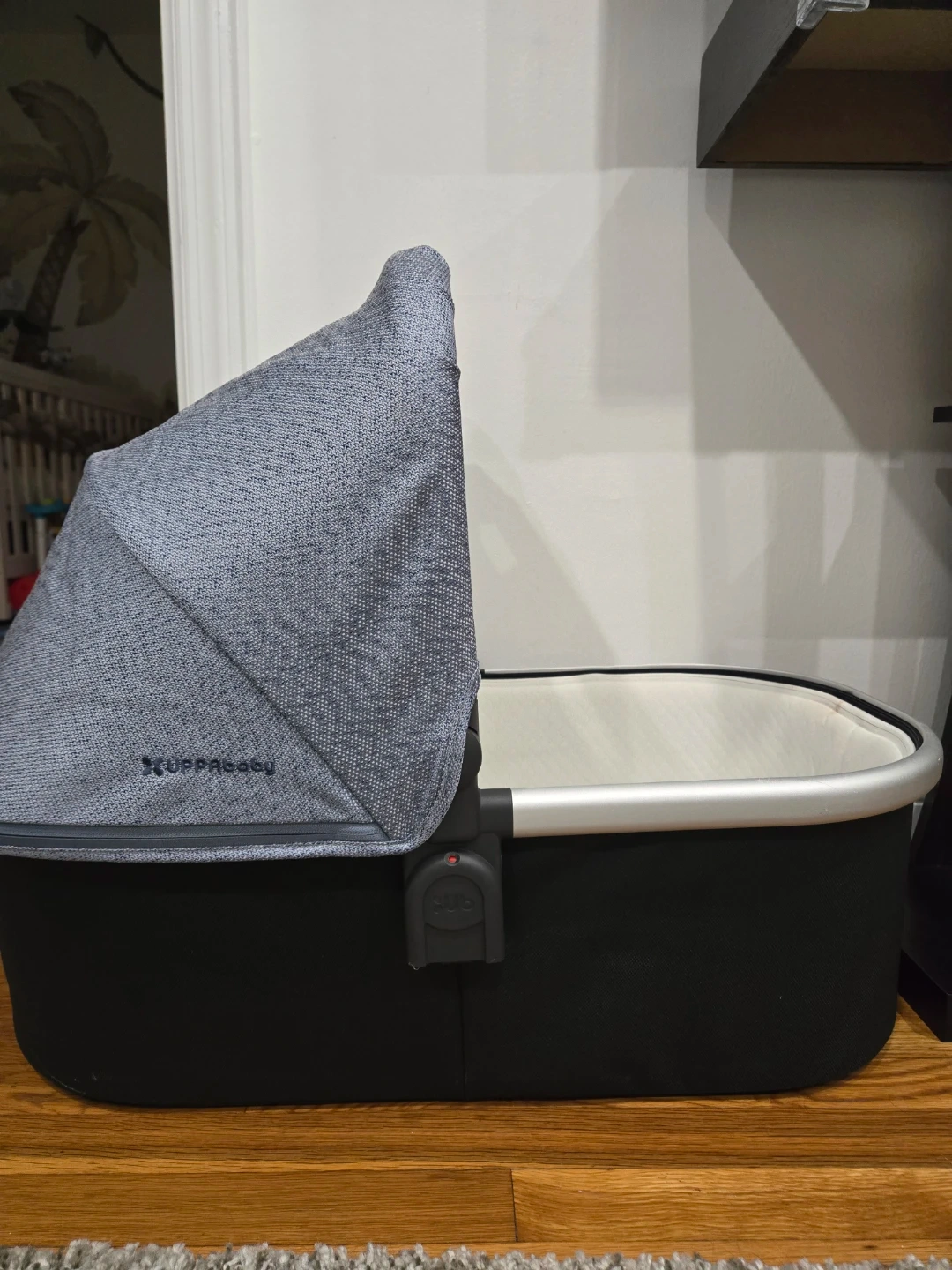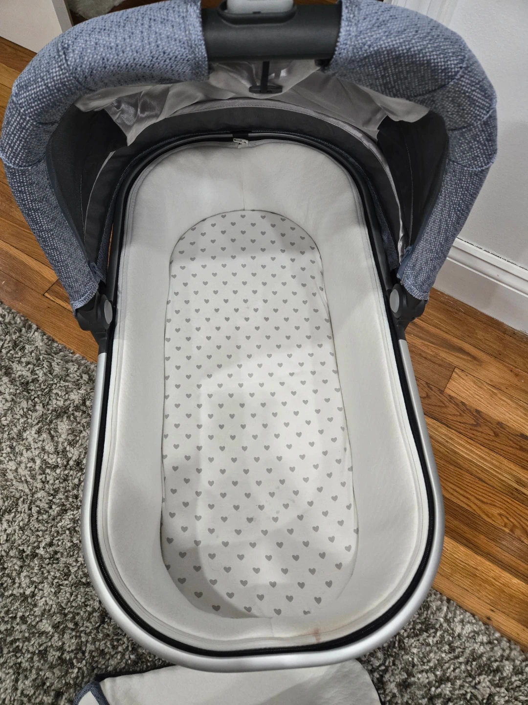 This UPPAbaby bassinet comes in a gray and black textured fabric. It has a white interior with a small heart pattern. It's a great option for keeping your little one comfortable while on the go!