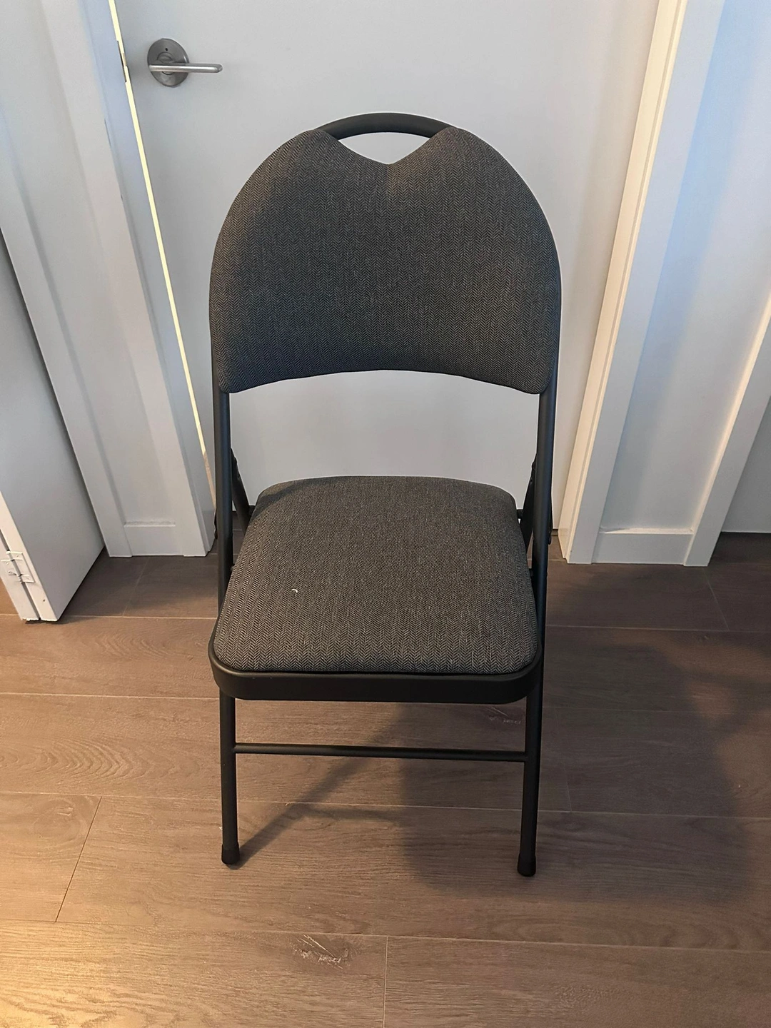 Simple, sturdy foldable chair with padded seat and backrest for comfort. Black metal frame with grey fabric upholstery. Folds flat for easy storage—perfect for small apartments, extra guests, desk seating, or events.