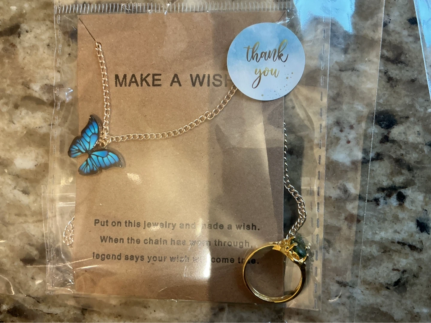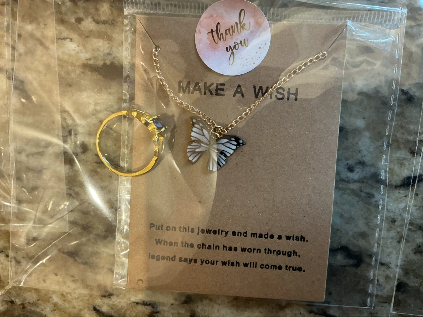 This is a 'Make a Wish' jewelry set featuring a butterfly necklace and a coordinating ring. The legend says your wish will come true when the chain has worn through. A fun little set for making a wish!