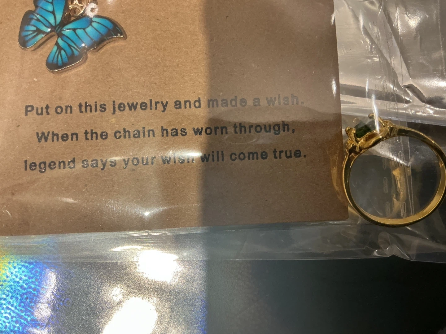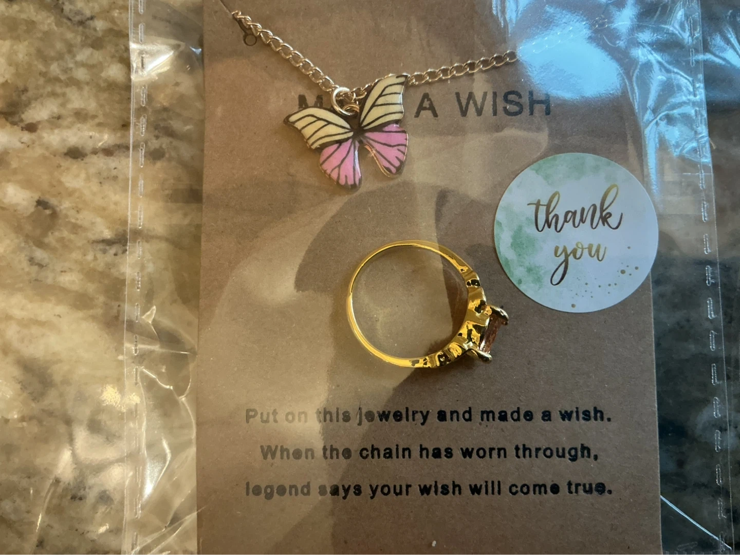 This is a 'Make a Wish' jewelry set featuring a butterfly necklace and a coordinating ring. The legend says your wish will come true when the chain has worn through. A fun little set for making a wish!