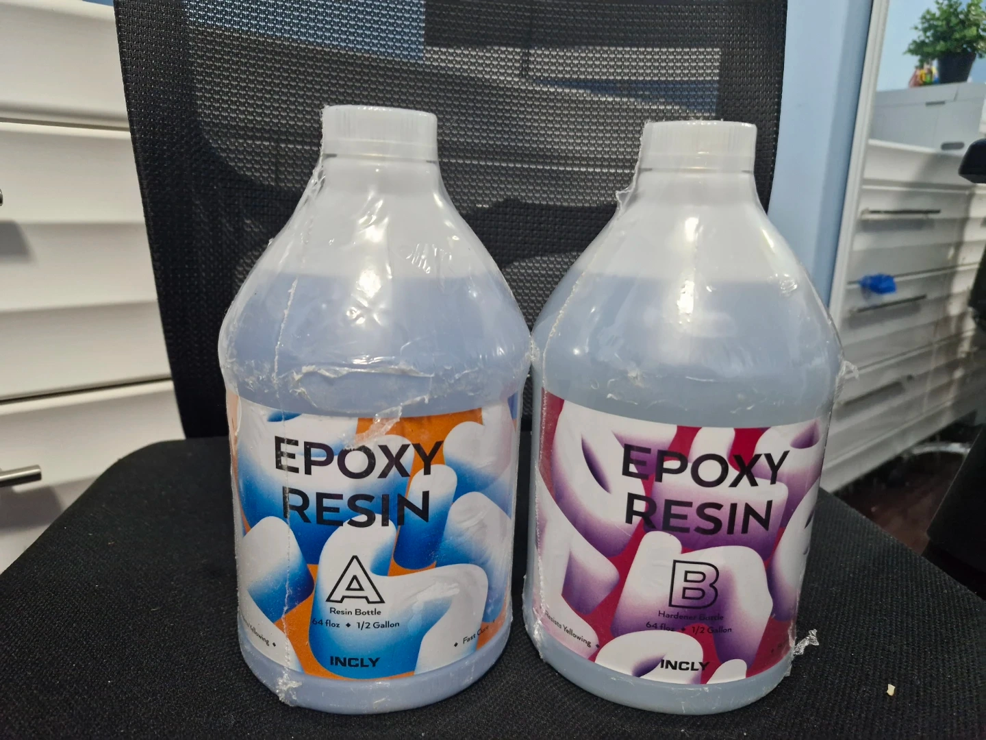This is a set of INCLY Epoxy Resin and Hardener, with each bottle being 1/2 gallon (64 fl oz). The resin is designed to be fast curing and resists yellowing. It's great for various crafting and repair projects.