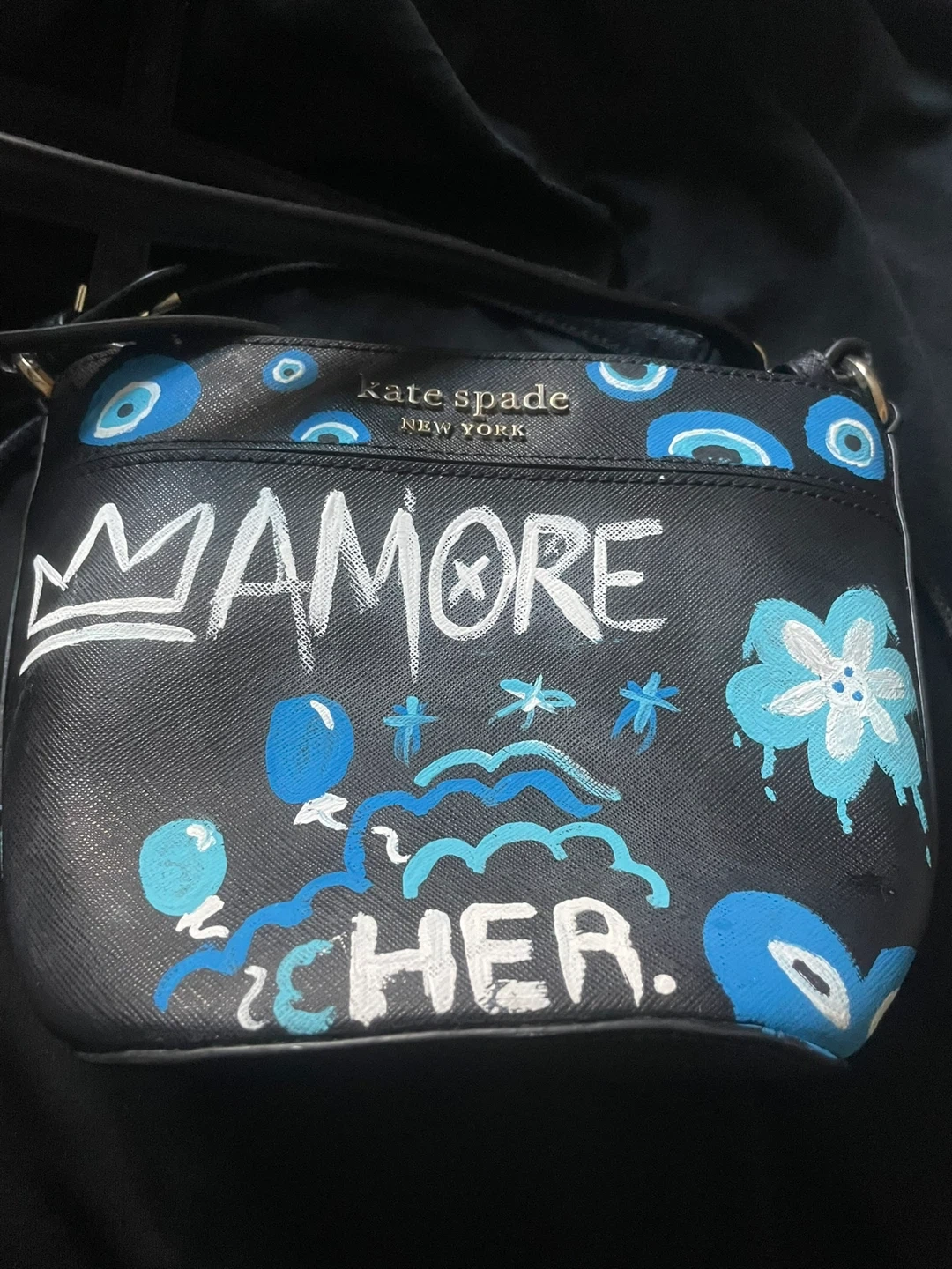 Kate Spade New York black crossbody bag. Features custom painted "AMORE CHER" text with blue evil eye and floral designs. Leather material.