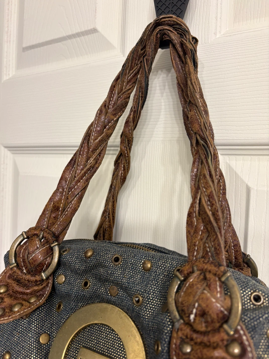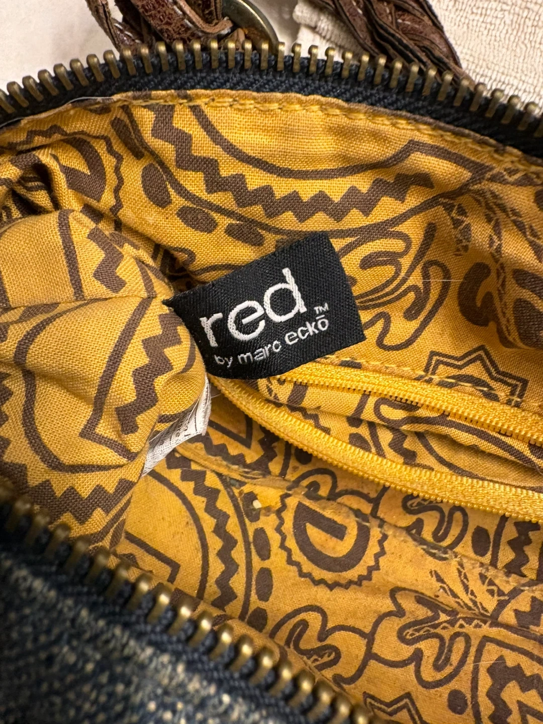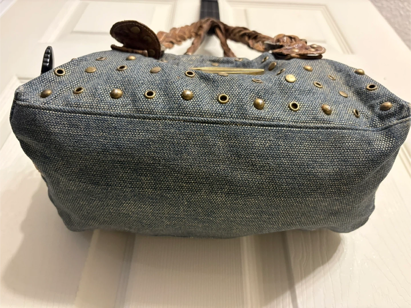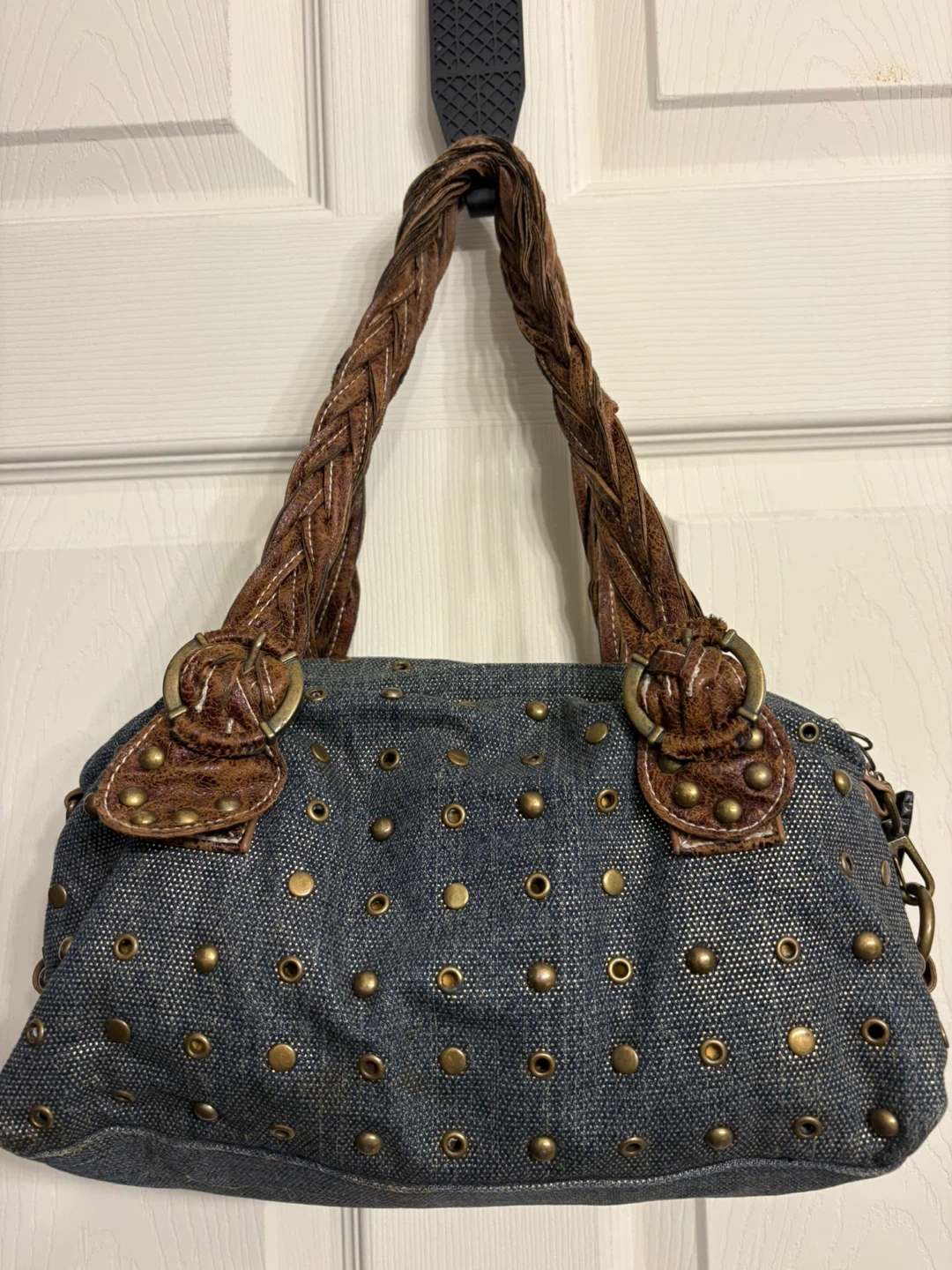 This Red by Marc Ecko handbag features a stylish studded denim exterior with distressed brown leather accents and braided straps. It includes a fun butterfly charm. It's a unique accessory! Great condition, just like new! Pick up in Chestermere.