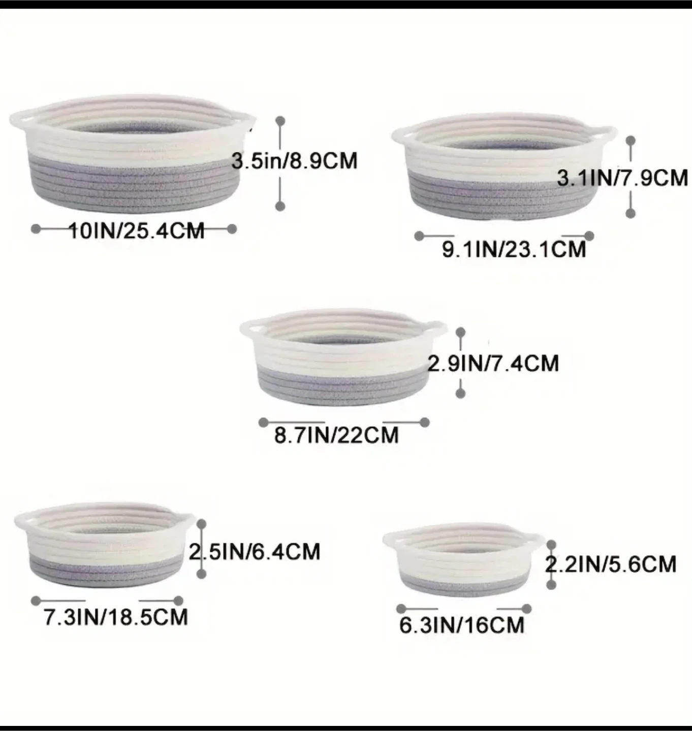 Declutter your space with this set of 5 cotton rope baskets! They're perfect for organizing various items around the house. The set includes baskets of the following sizes: