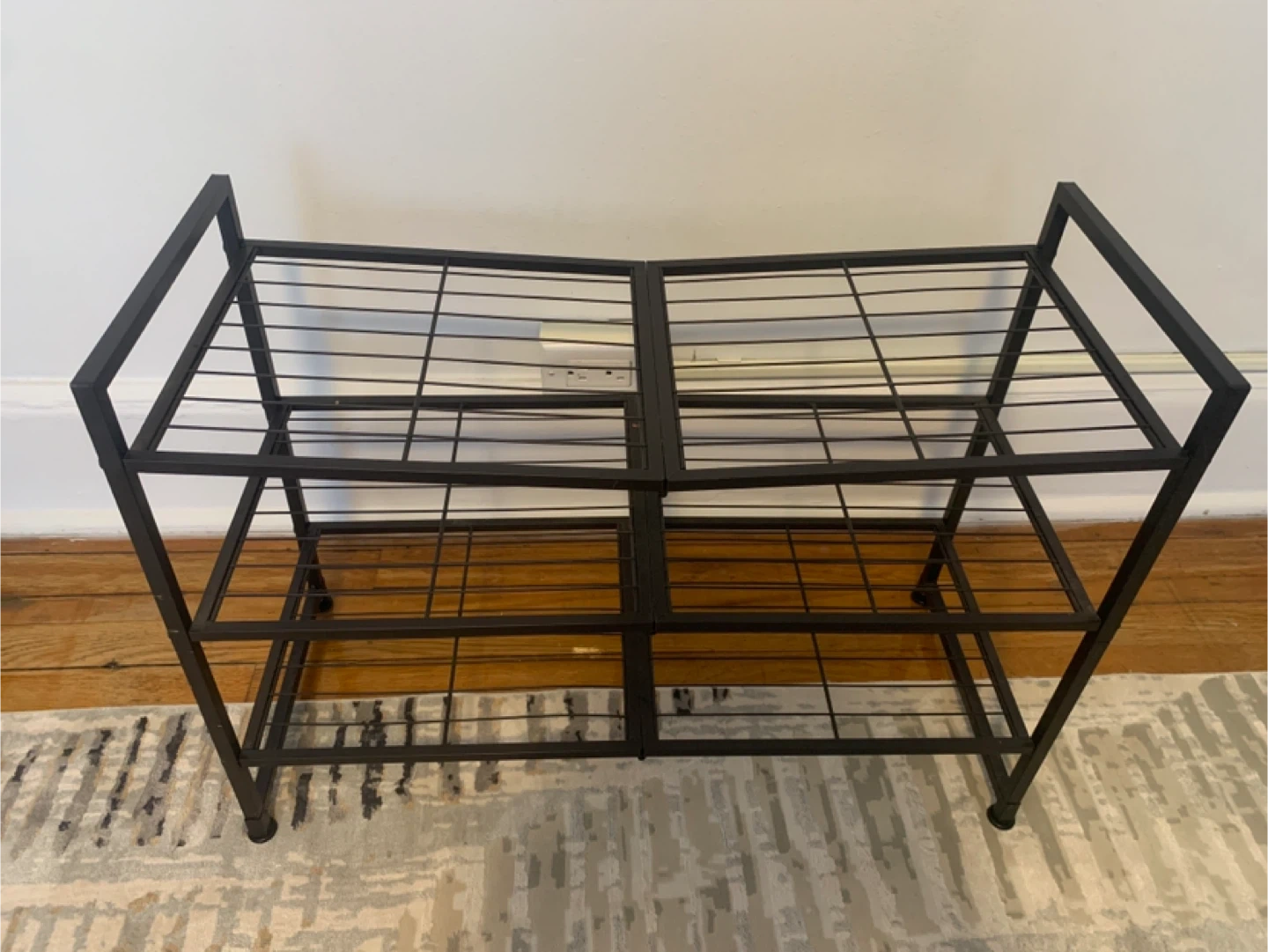 Selling a metal shoe rack in black! It's in great condition and ready to organize your shoes. It features a simple, sturdy design, perfect for any entryway or closet