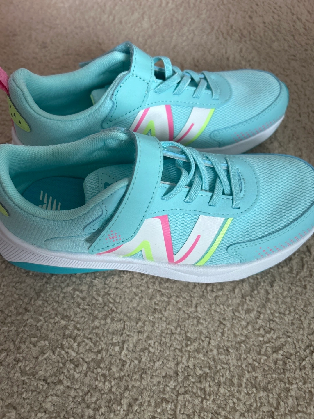 These New Balance kids' sneakers are brand new! They are a lovely aqua in color with colourful stripes. The are size 3. Perfect for your little one!