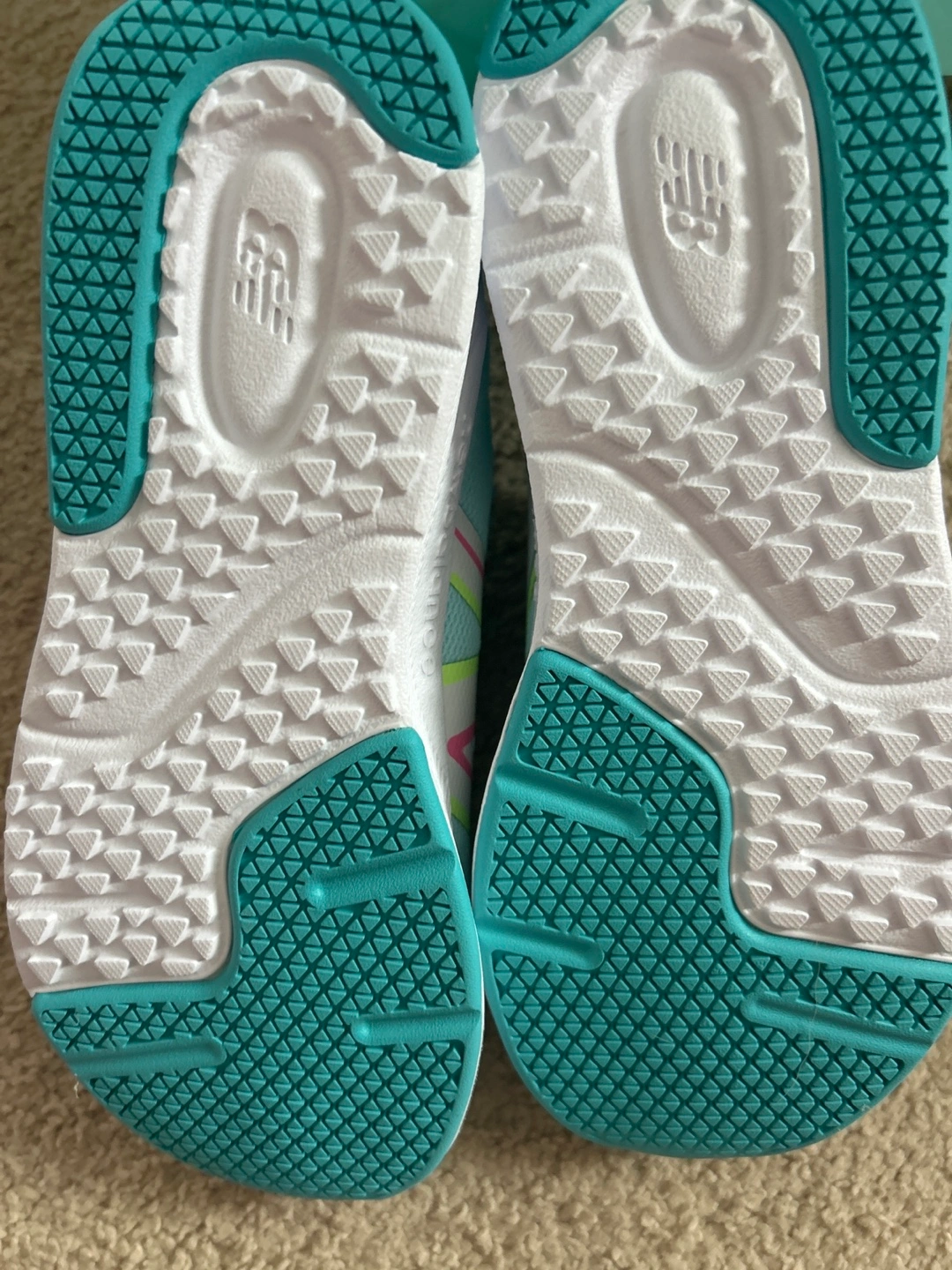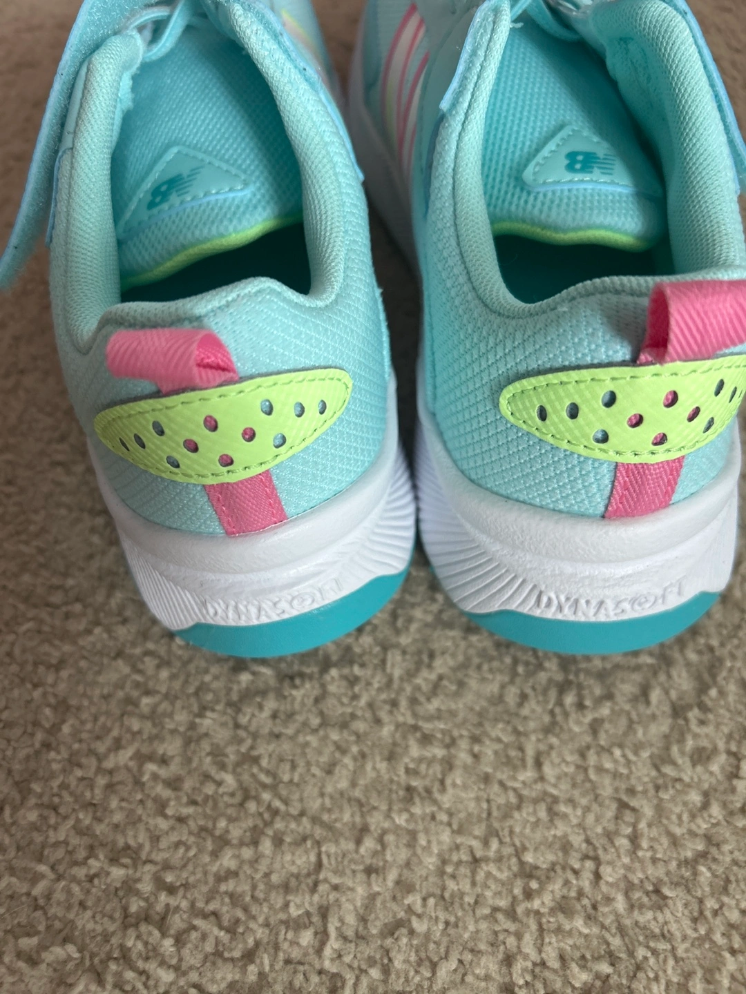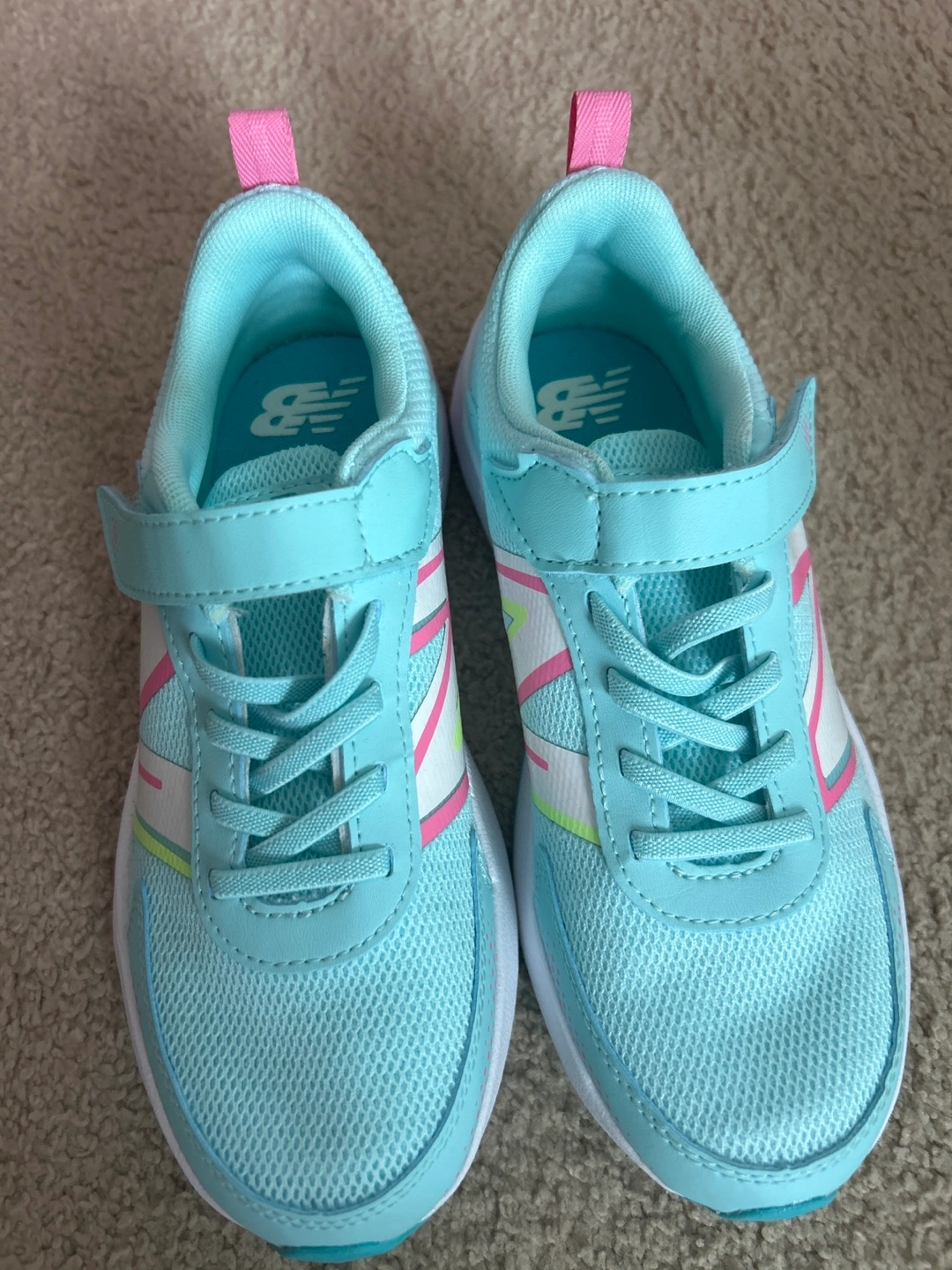 These New Balance kids' sneakers are brand new! They are a lovely aqua in color with colourful stripes. The are size 3. Perfect for your little one!