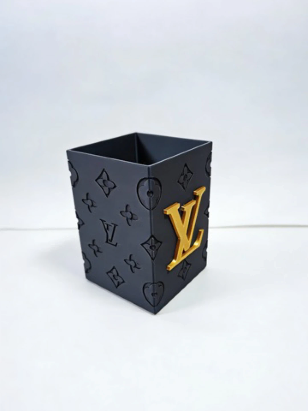 This is a black organizer box featuring the Louis Vuitton monogram pattern and a gold LV logo. It's a stylish way to keep small items tidy. The box is made from a durable material.